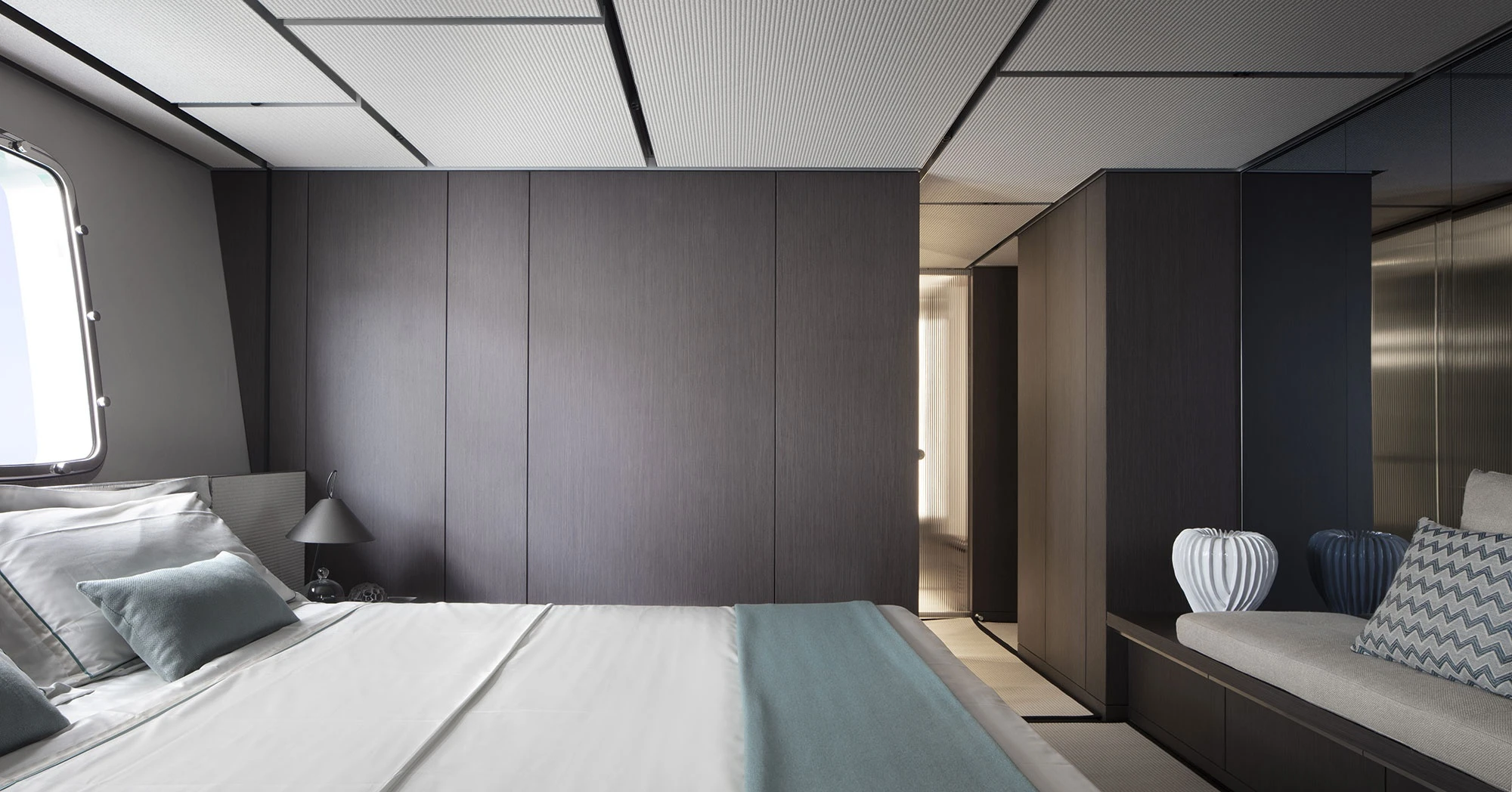 On the lower deck, SX112 offers accommodation in three large cabins, one for the owner and two VIP cabins, as well as a lounge area characterized by wooden boiserie and mirrored walls, which can be transformed into an extra cabin with one king-size or two twin beds. The lower deck also features a kitchen directly connected to the crew quarters.