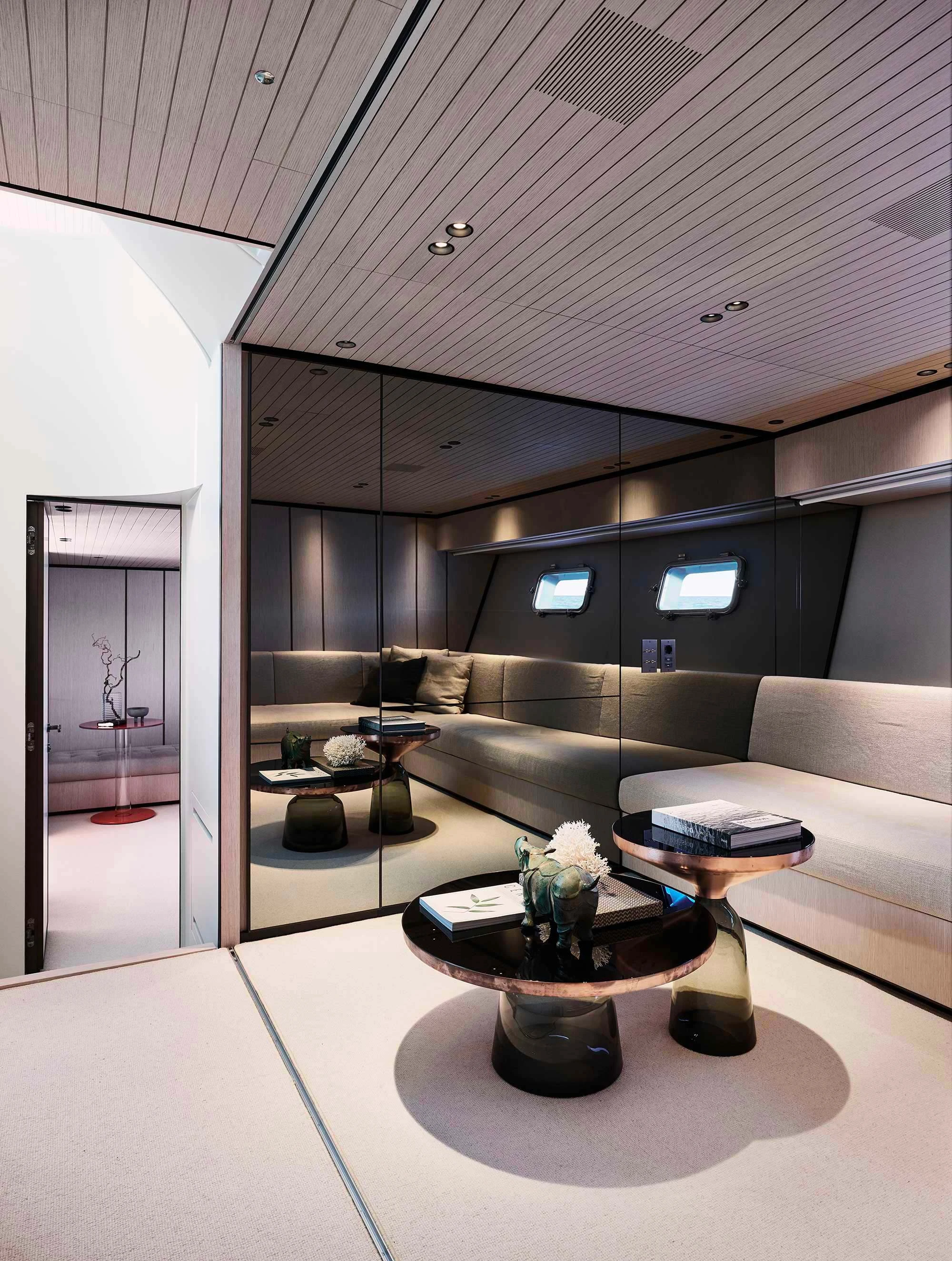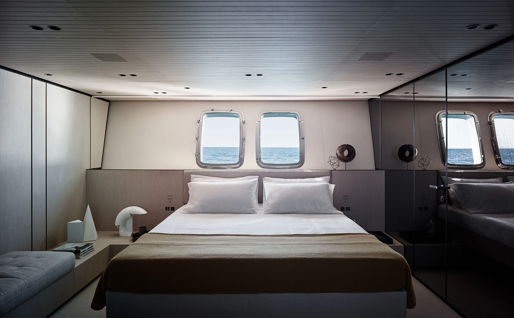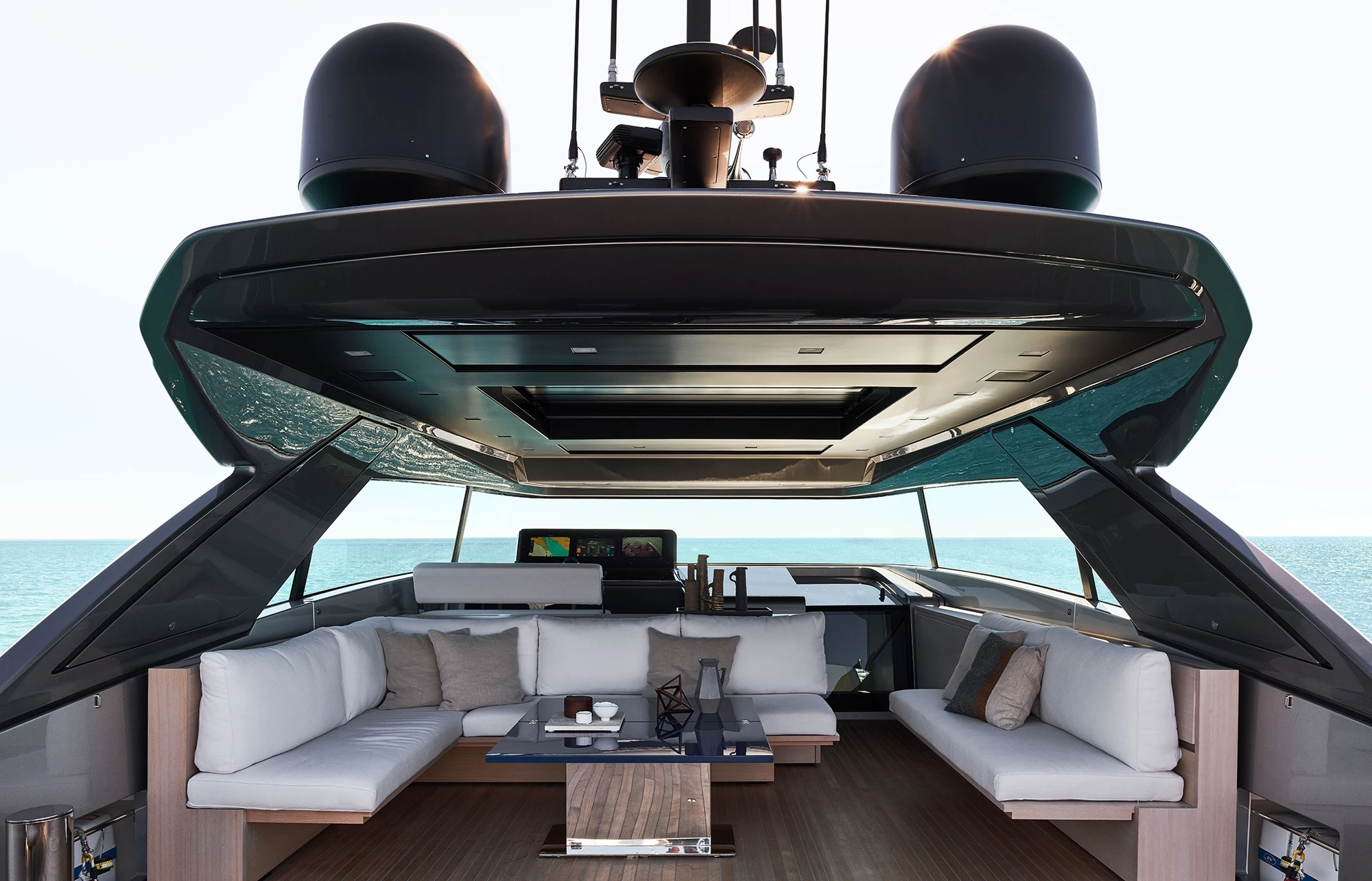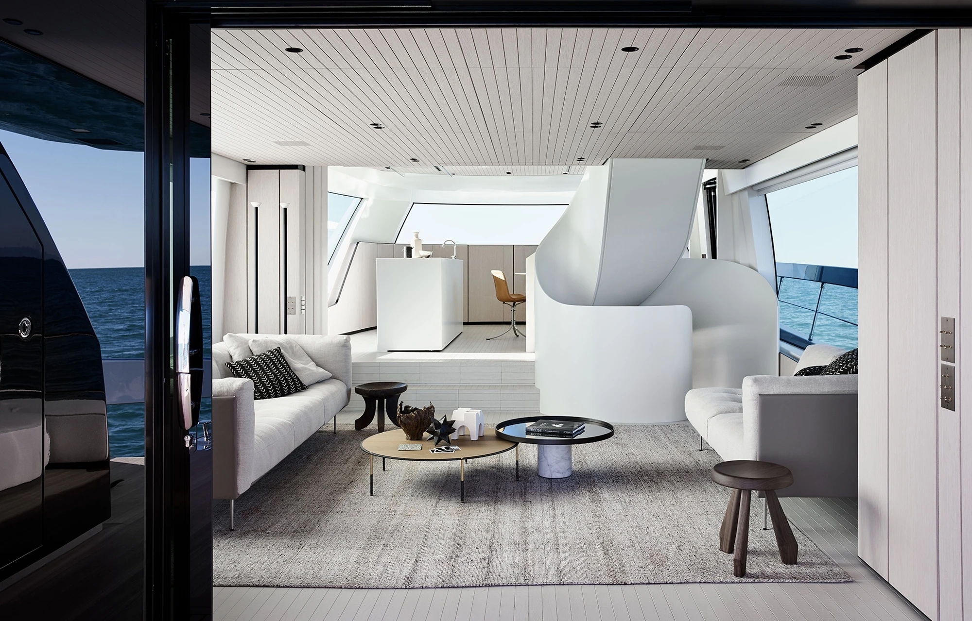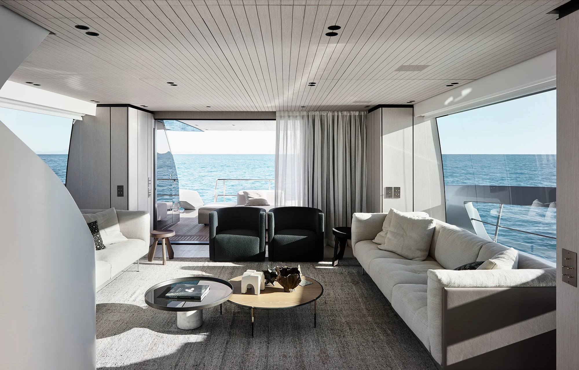 The SX76 project proposes, on a smaller scale, the idea presented for the first time in the SX88, of an open-space yacht, a "social" boat that thus develops into a unique and continuous environment from stern to bow where the interior living space is maximized with the open kitchen, adjacent to the dining room, next to the living area, with seamless continuity between the interior and exterior, thanks to the large windows overlooking the sea.