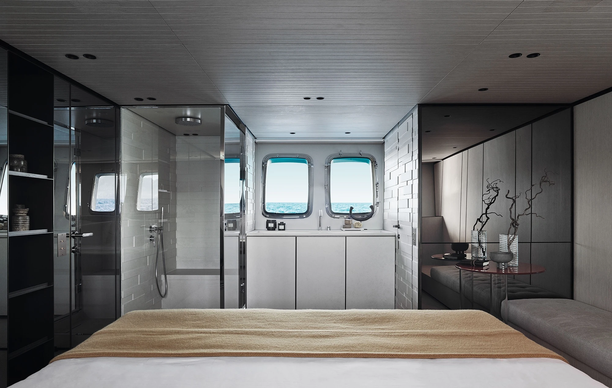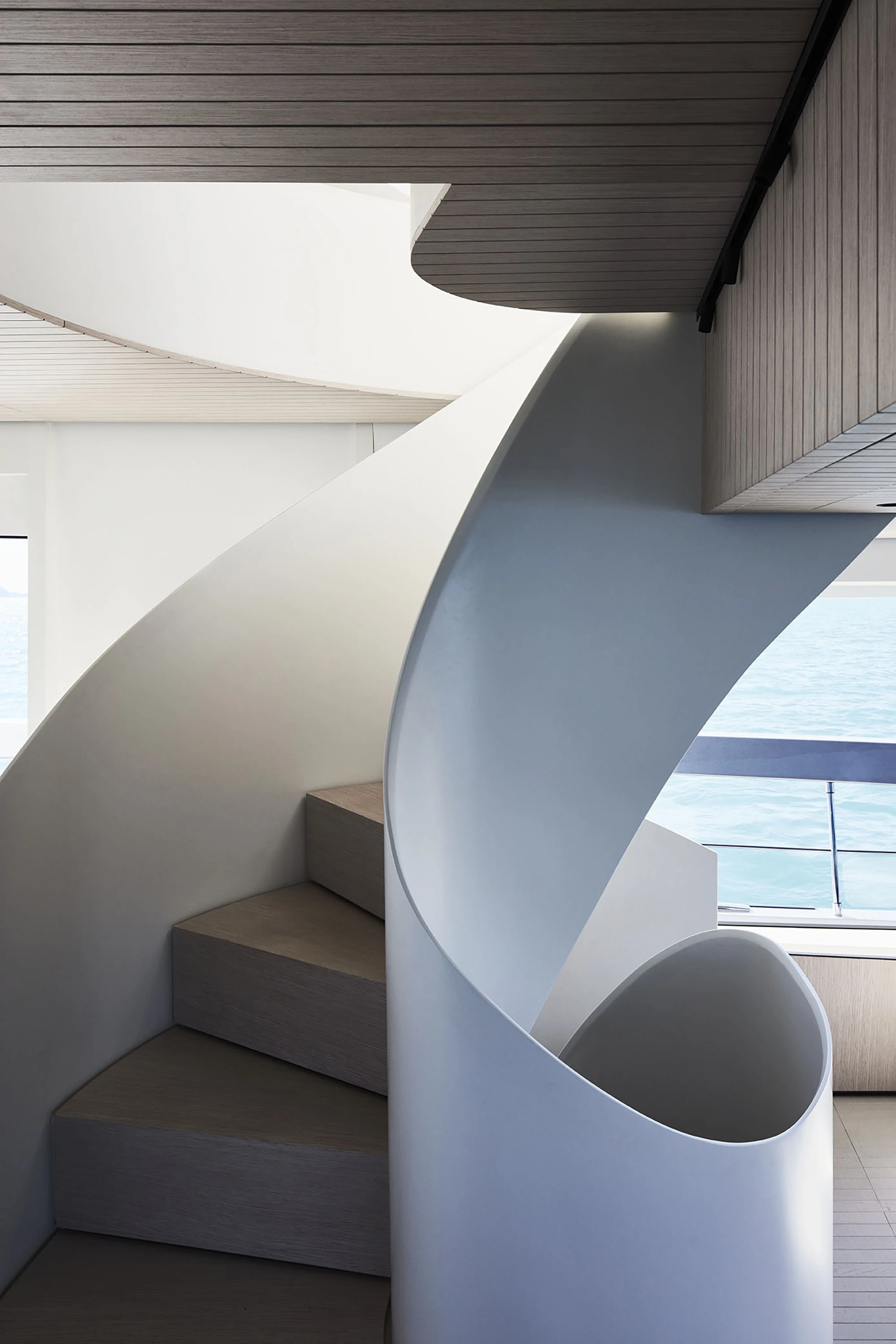 The ultimate protagonist of the interior design project, the picturesque staircase designed specifically by Lissoni for the SX76, a true sculpture that develops like a sinuous and continuous line flowing into the lower deck, going back up to the flying bridge, across the main deck without any interruption.