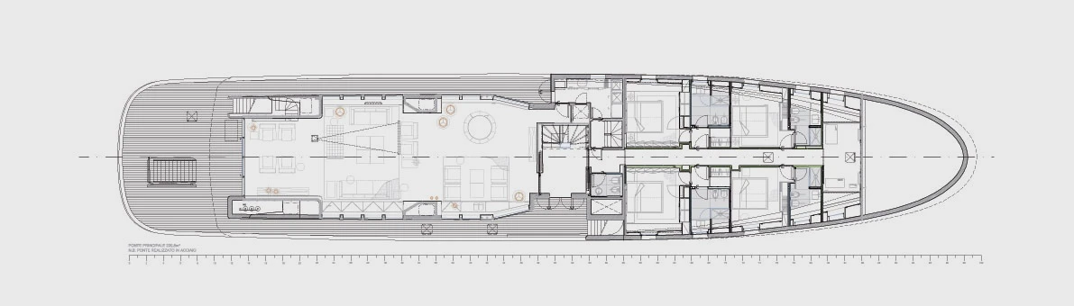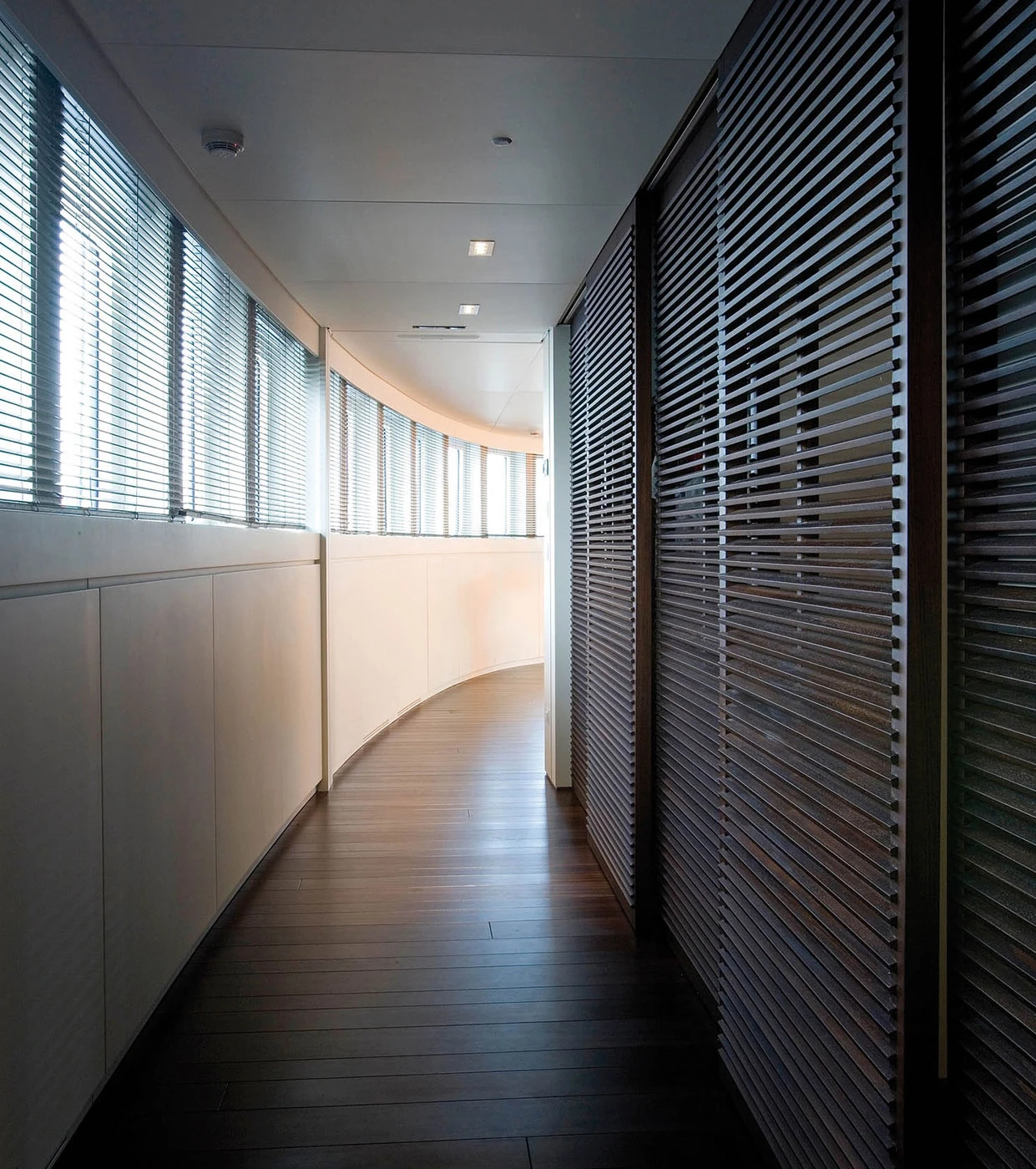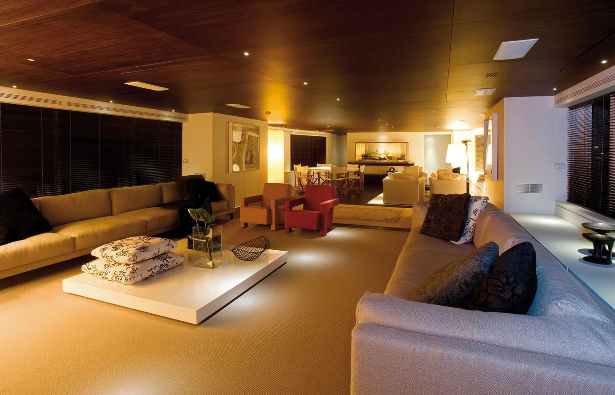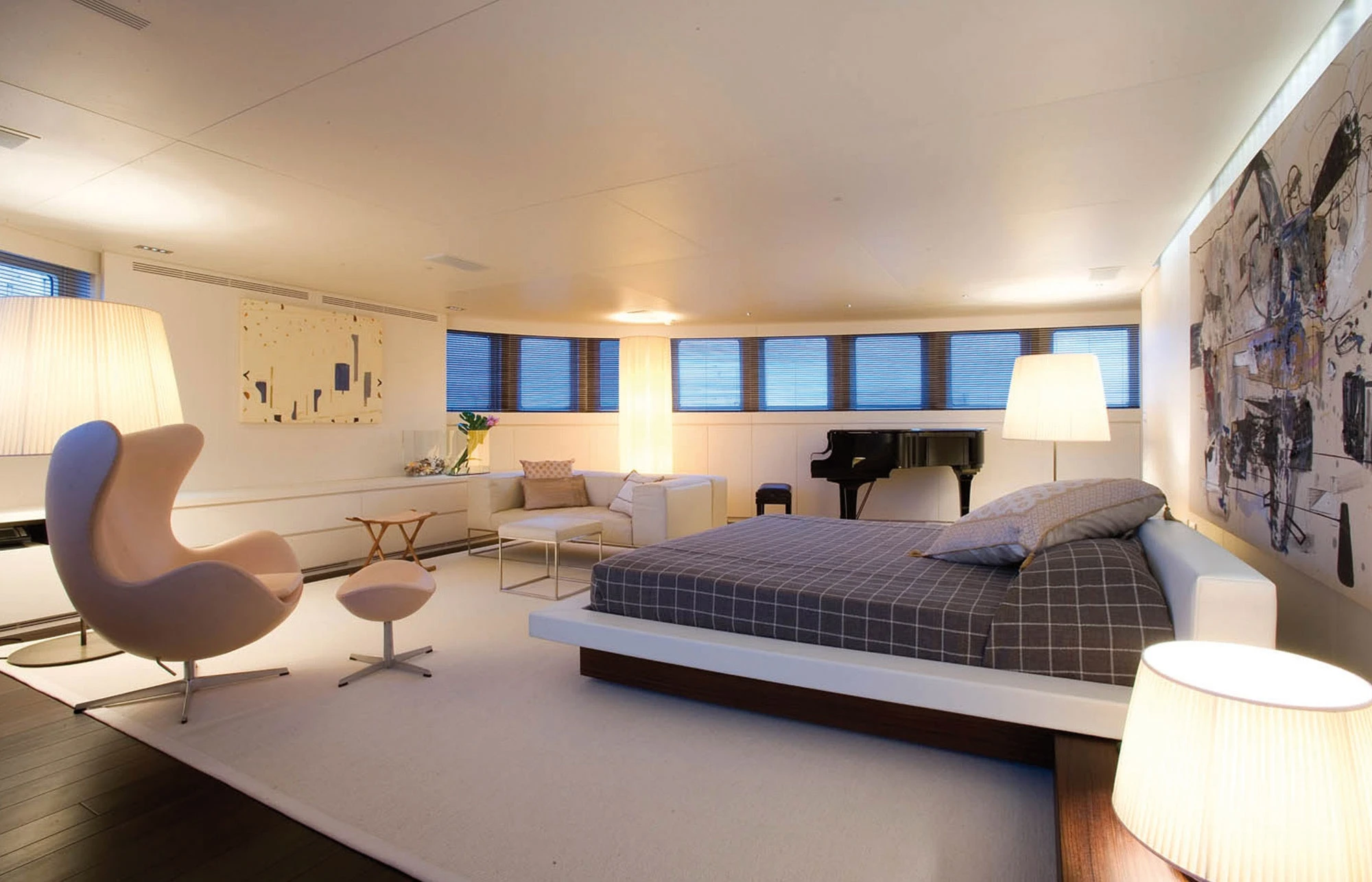 The yacht Tribù is a robust and environmentally friendly vessel that is able to sail the most challenging seas. The interior is like a “floating villa” for living and working: a private lounge, gym, bathroom and spa comprise the owner’s suite while invitees are accommodated in the four guest rooms.