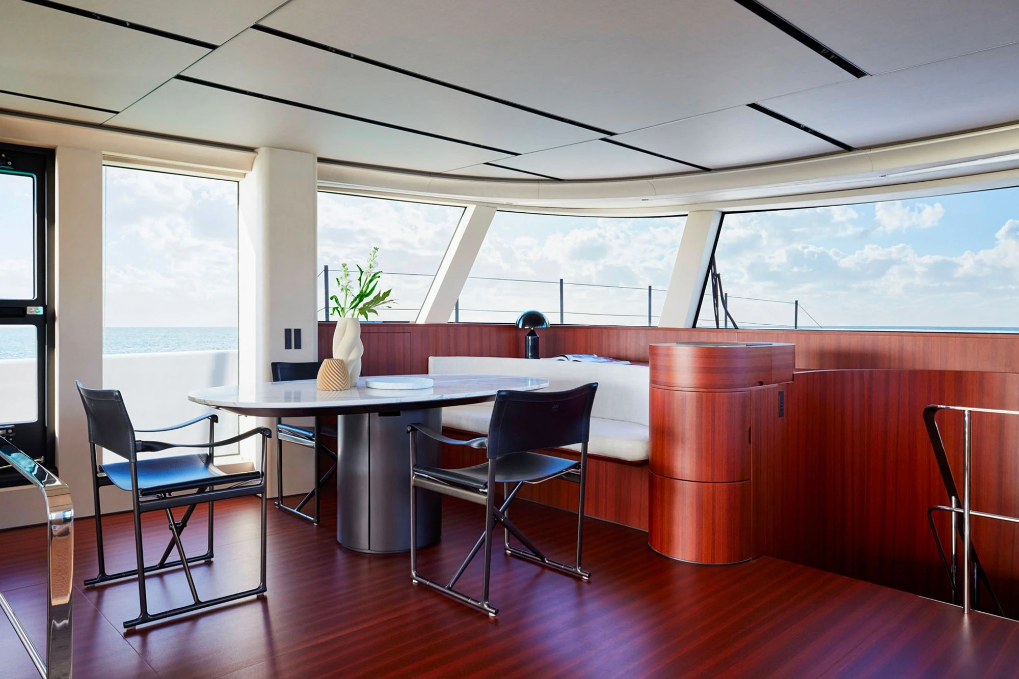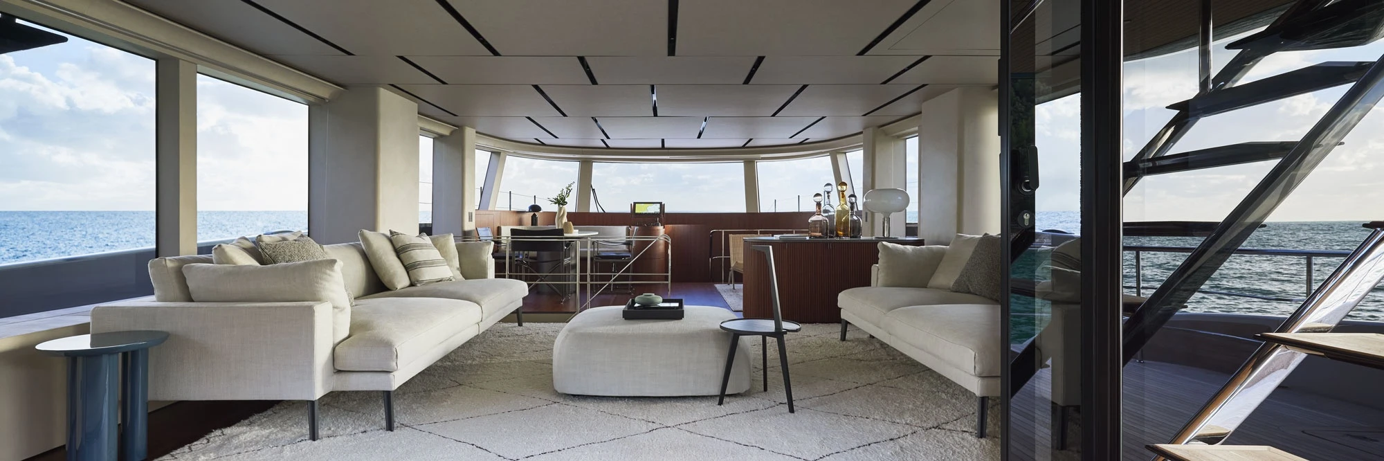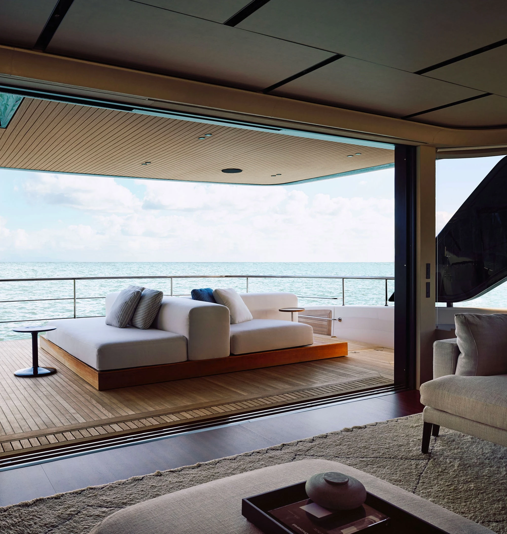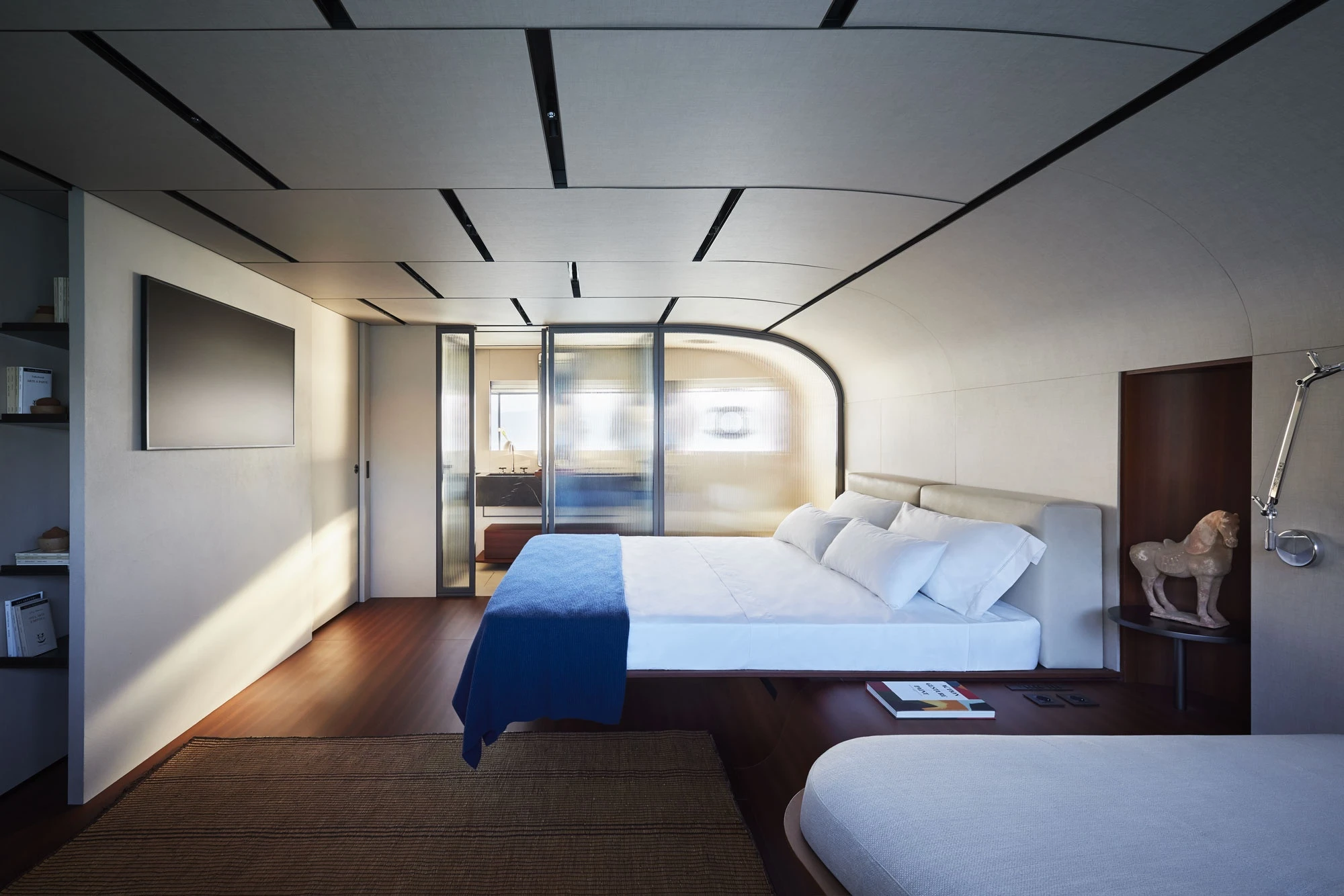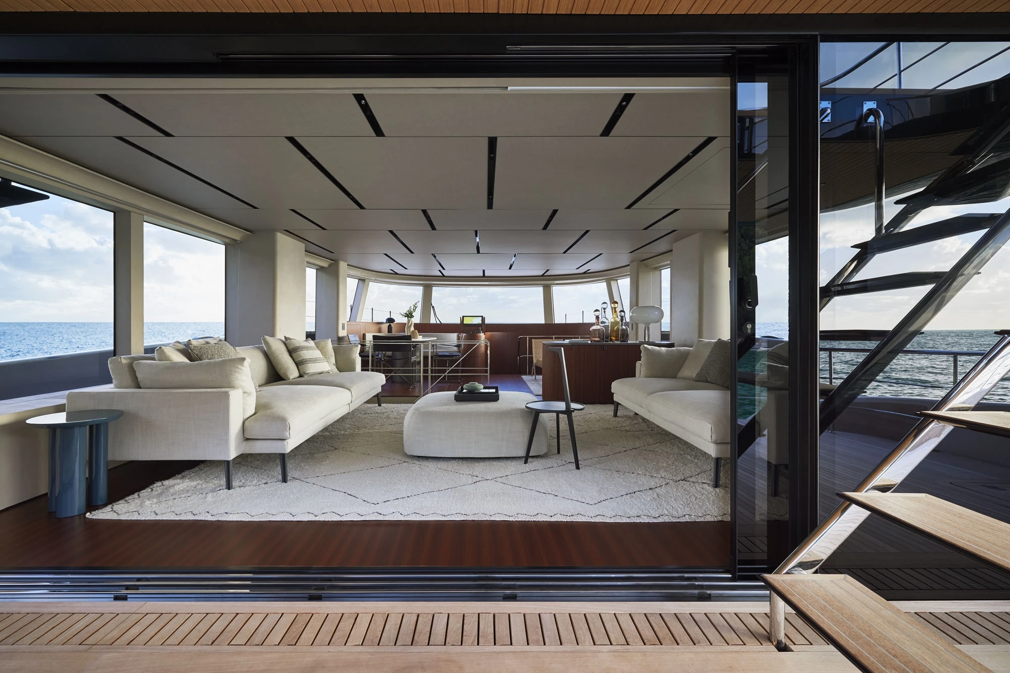 The elegant and sophisticated interior design establishes a strong dialogue between the interior and exterior thanks to large windows and hybrid spaces, while the layout of the cabins follows the configuration of the hull, taking full advantage of the catamaran's distinctive forms.