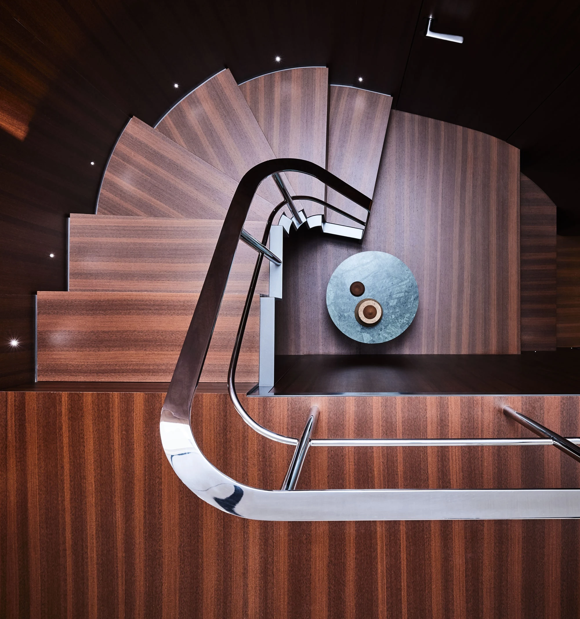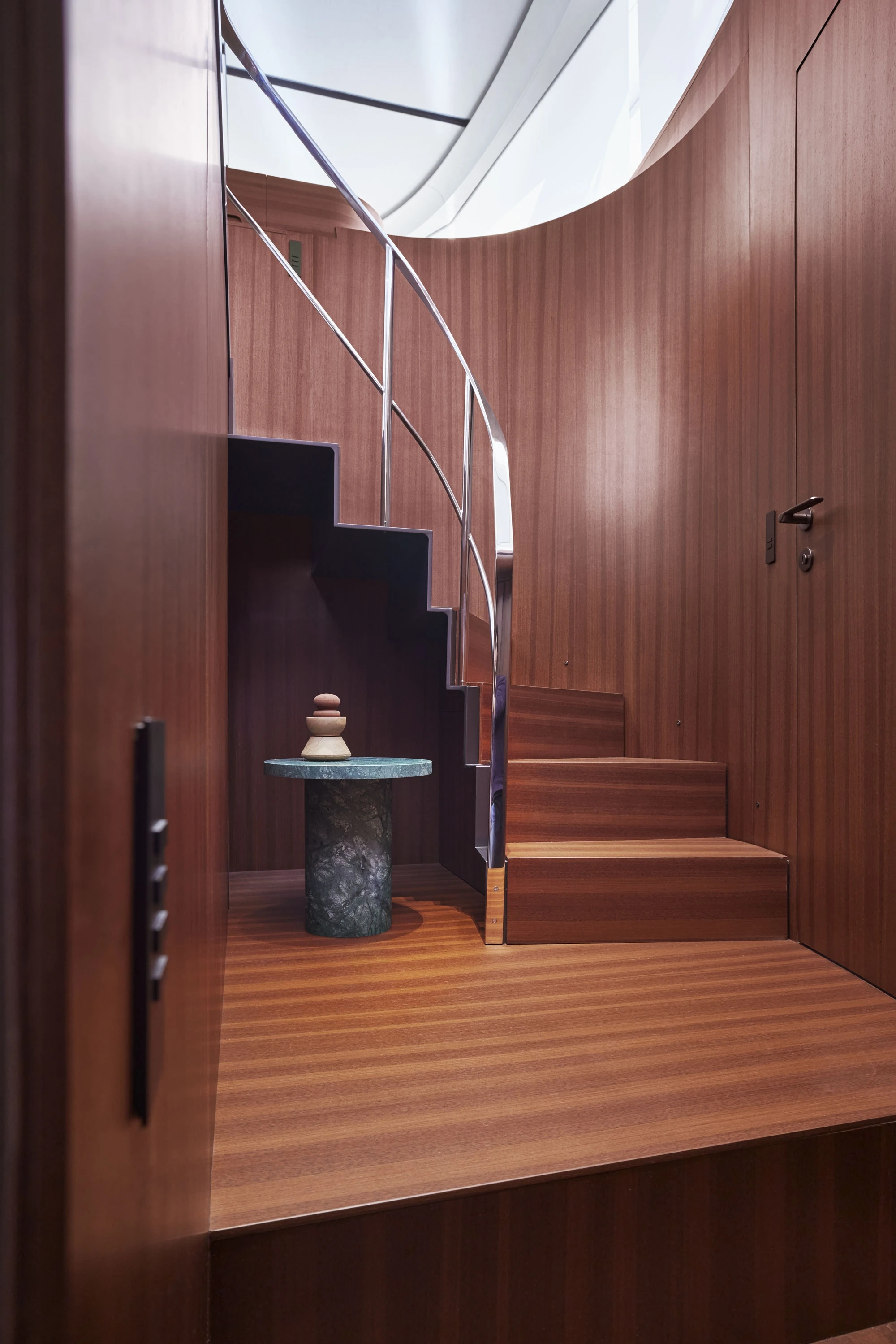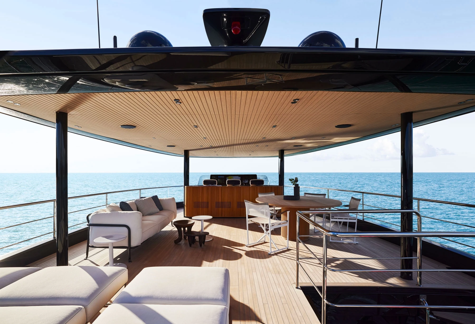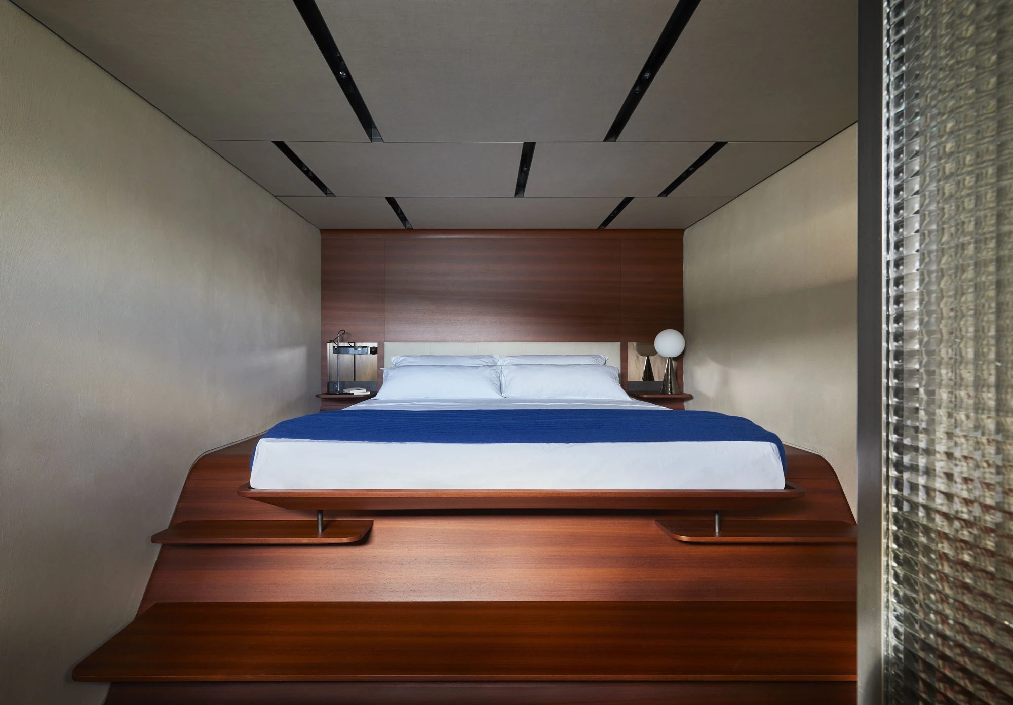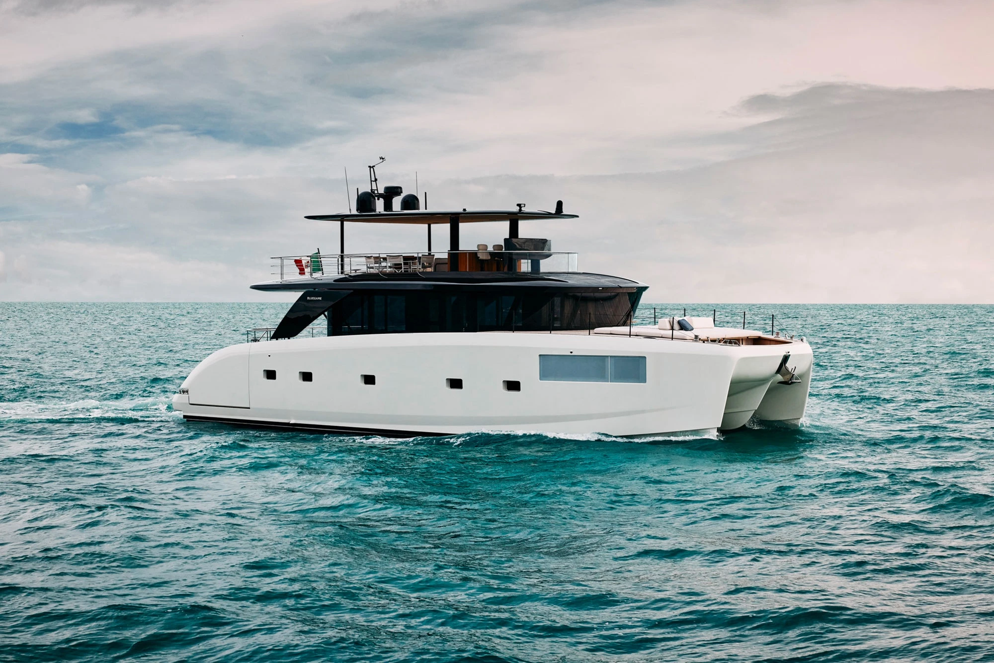 The elegant and sophisticated interior design establishes a strong dialogue between the interior and exterior thanks to large windows and hybrid spaces, while the layout of the cabins follows the configuration of the hull, taking full advantage of the catamaran's distinctive forms.