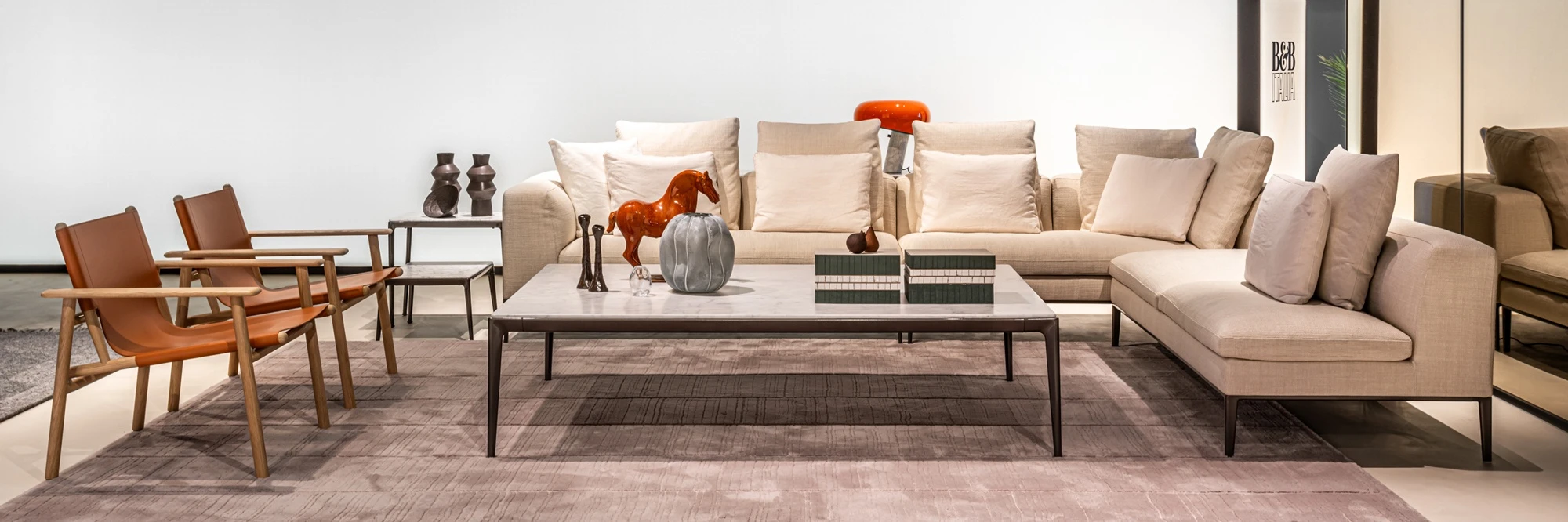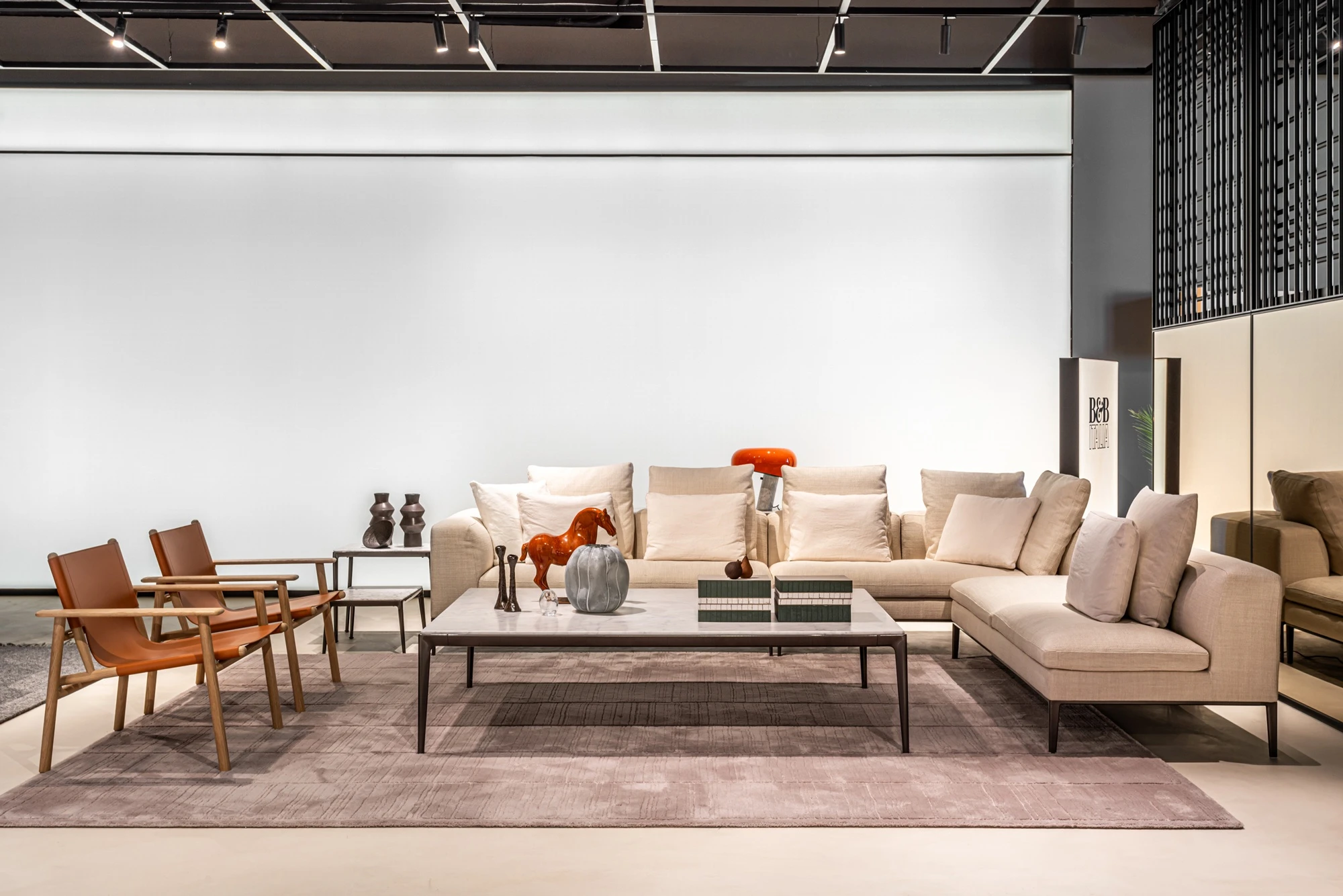 Spanning across two floors and seamlessly blending retail and project planning, the space offers diverse styles from minimal to decorative, with a constant accent on contemporary living. The perimeter windows create the impression of a glass box in which the products and interiors are strikingly visible.