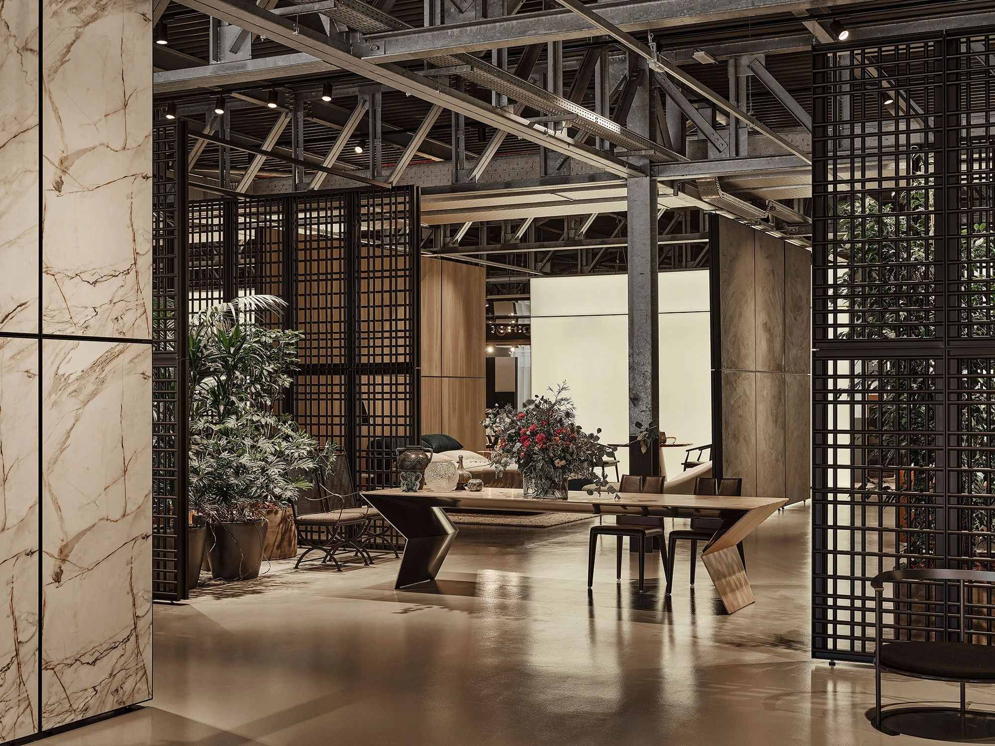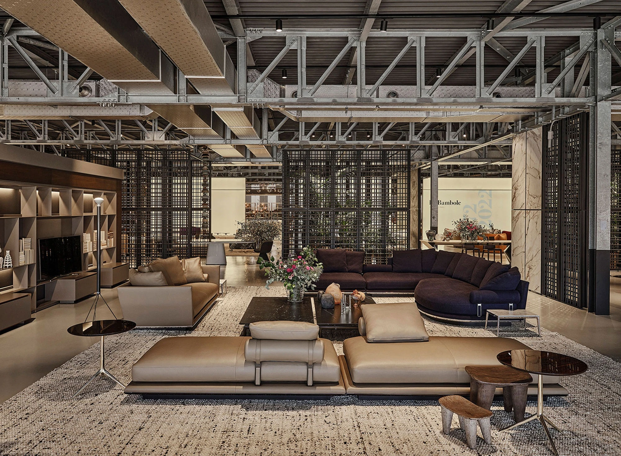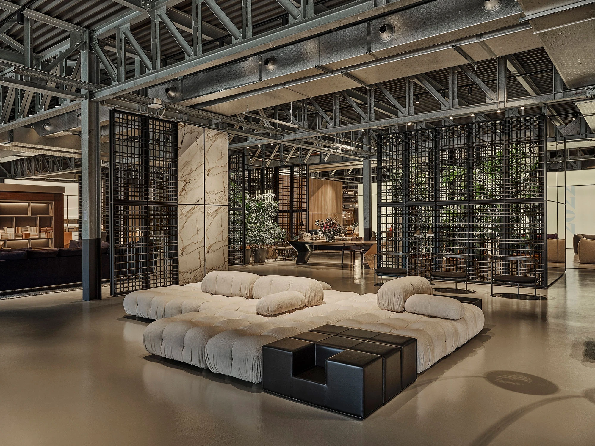 The project starts from the idea of wanting to give voice to the industrial soul, emphasizing its architectural structure and designing the showroom within as an enormous theatre space. The spaces were expanded and new colors were chosen, while the floor in cement allows it to integrate effortlessly with other materials and objects (fabrics, carpets, etc.), because the aim is to rotate the products frequently and propose ever new settings. Light is a fundamental element of the project, and the choice focusses on a selection of decorative lamps to produce warm and homely settings for the products from the collection. At the same time, the space is flanked by backlit walls to offer a surprise effect. Lastly, the gardens and plants work to connect and create a dialogue between the interior and the exterior in seamless continuity.