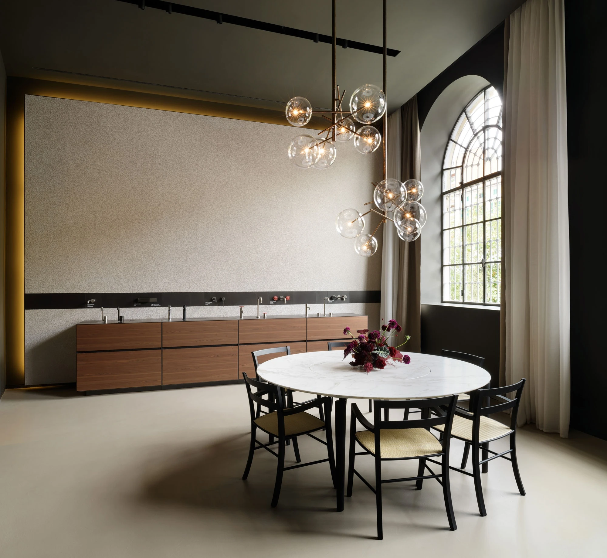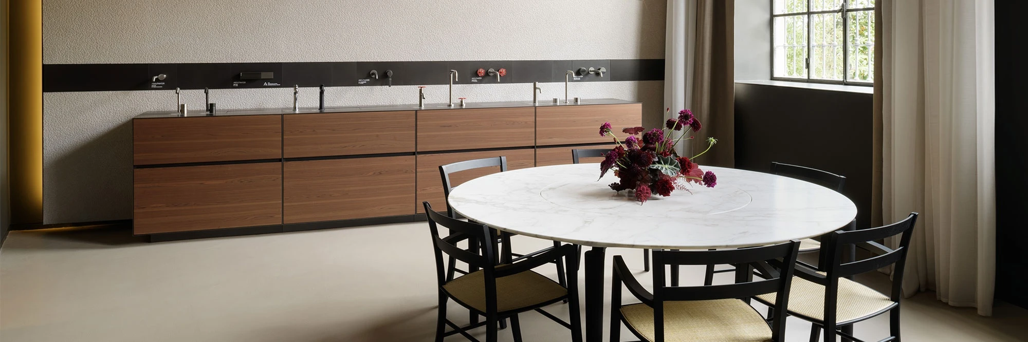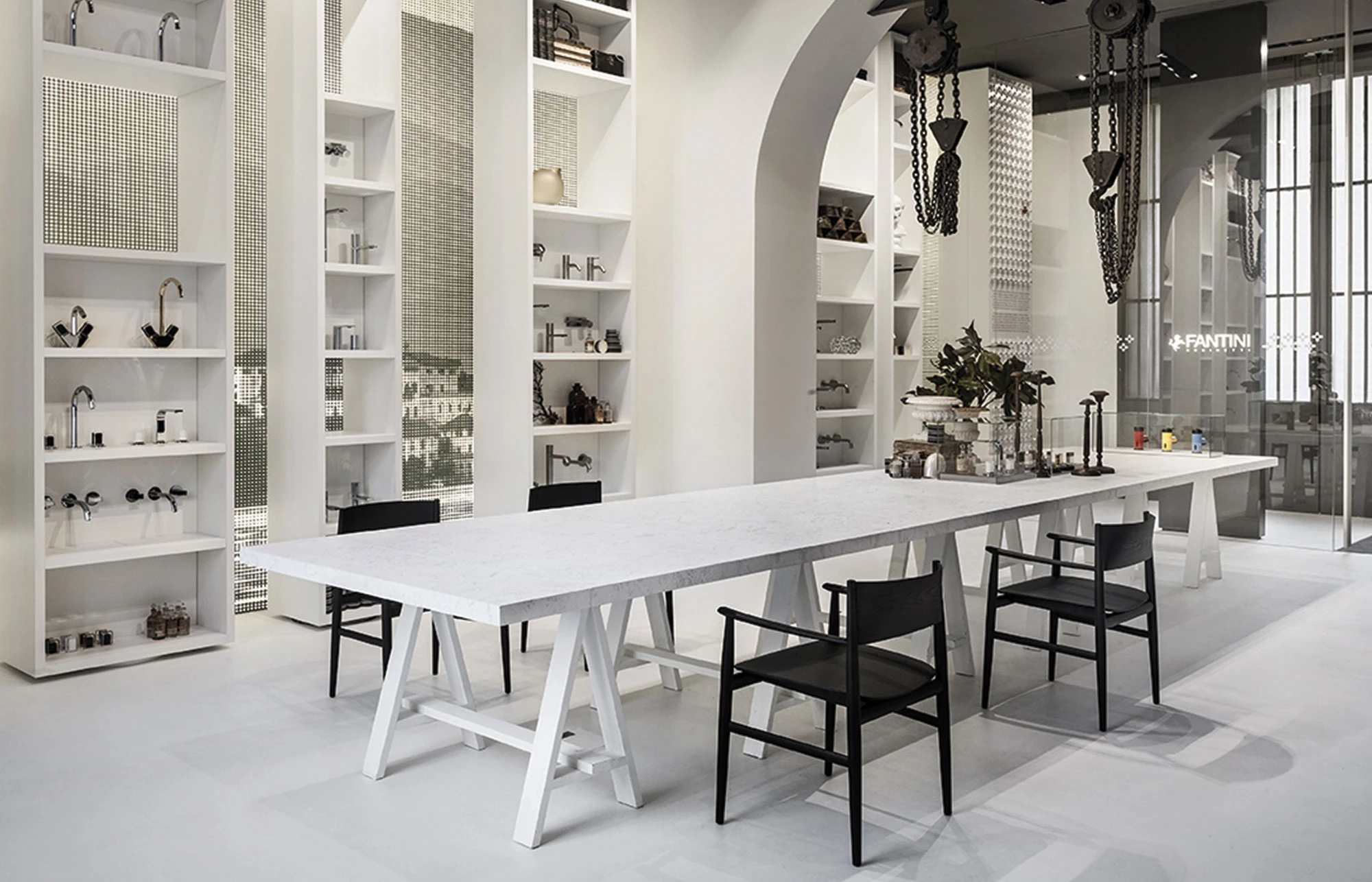The showroom was renovated in 2024 along very precise lines to create a display for functional products, such as the taps, while recalling the welcoming atmosphere of Casa Fantini.