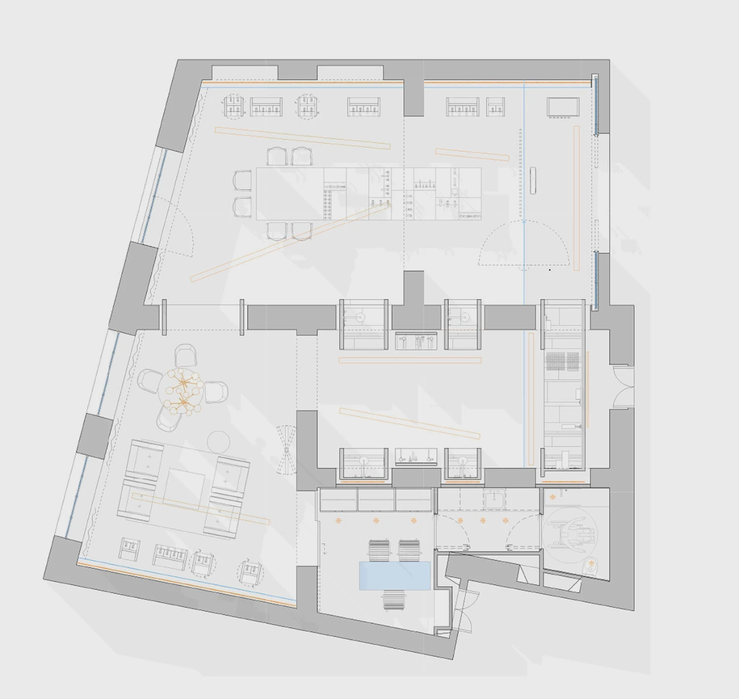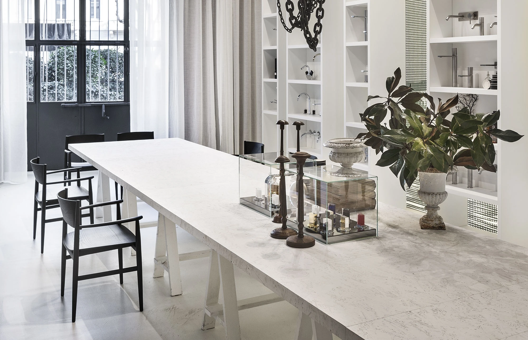 Fantini showroom Milano opens in the heart of the city at Via Solferino 18: the architectural setting is characterised by a spatial division that respects the original structure, of which several elements are preserved, and by the choice of stone as the preferred material. Brightness is the design’s principal aspect, created through a colour palette dominated by the white of walls, bookcases, the large table and the armchairs, the pastel grey of the dramatic, ample curtains which, by contrast, enhance the product gallery’s dark stone Pietra d’Avola by Salvatori.