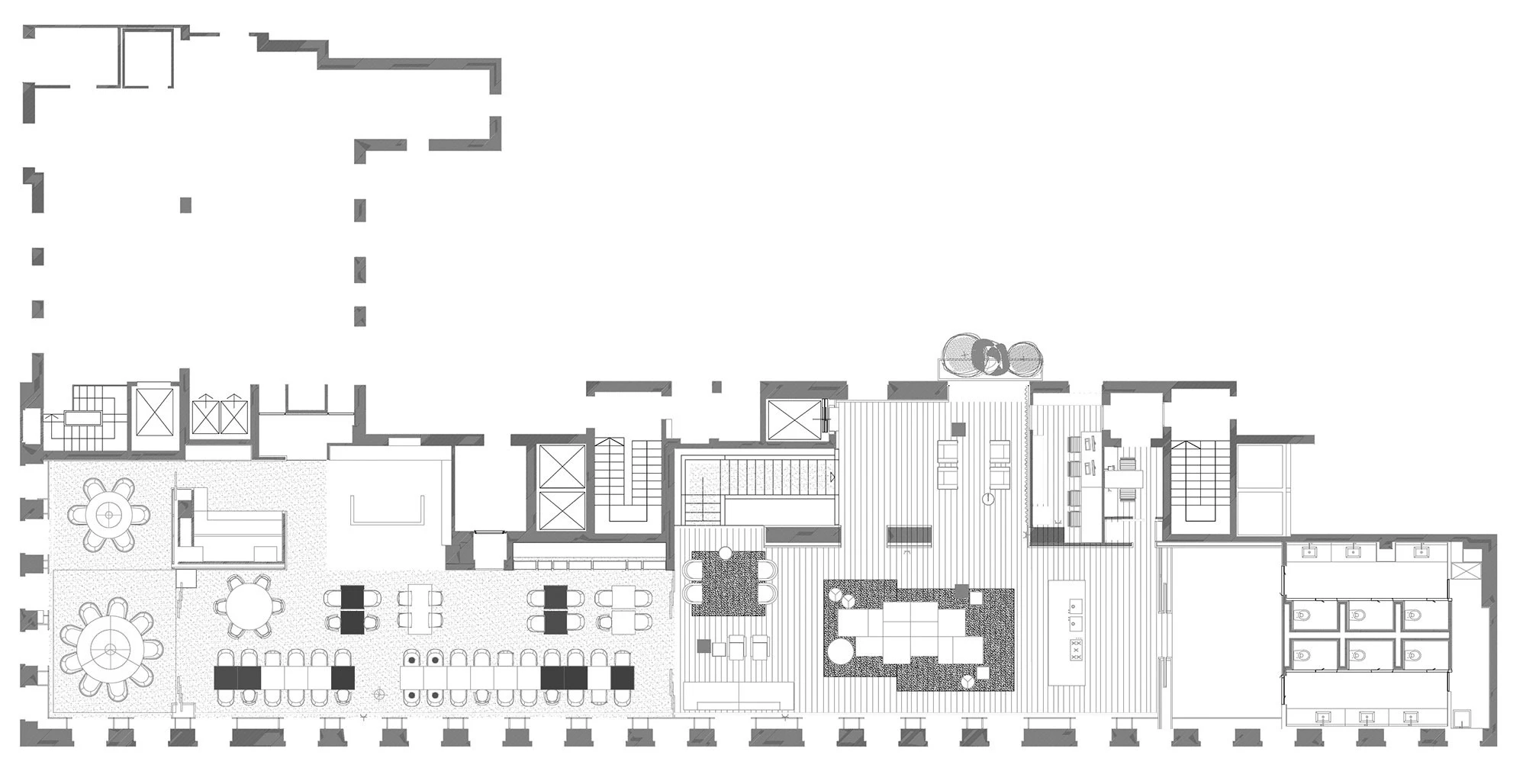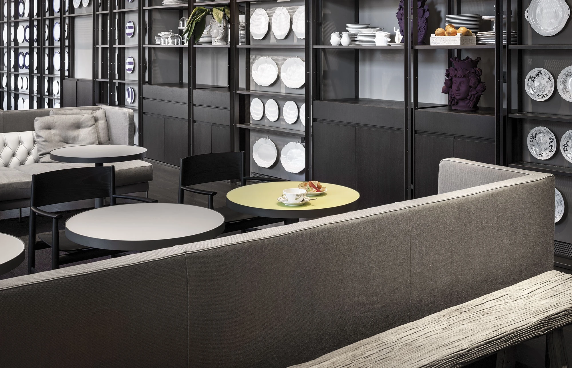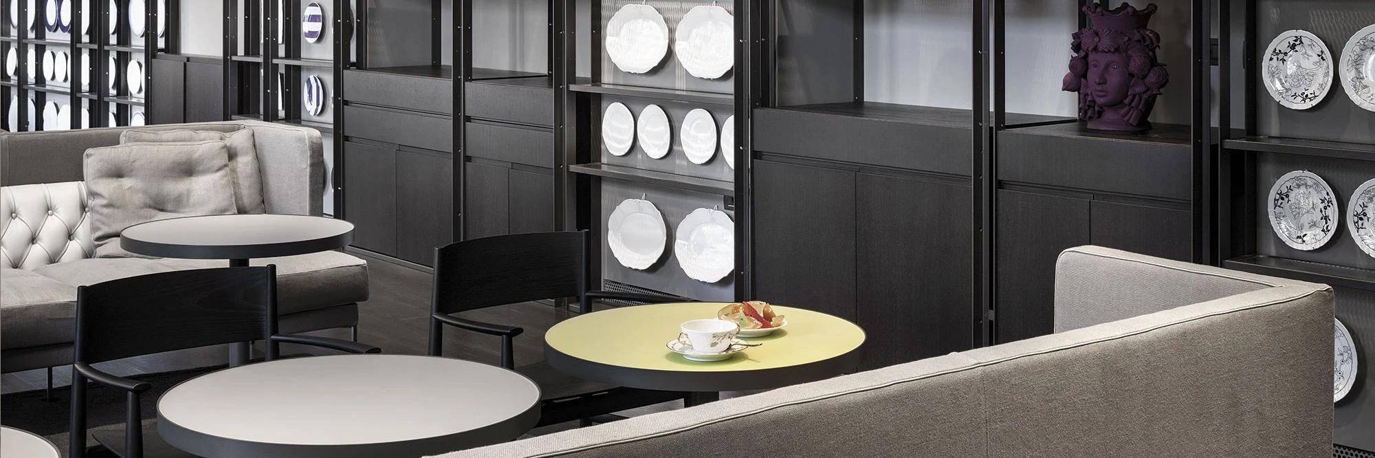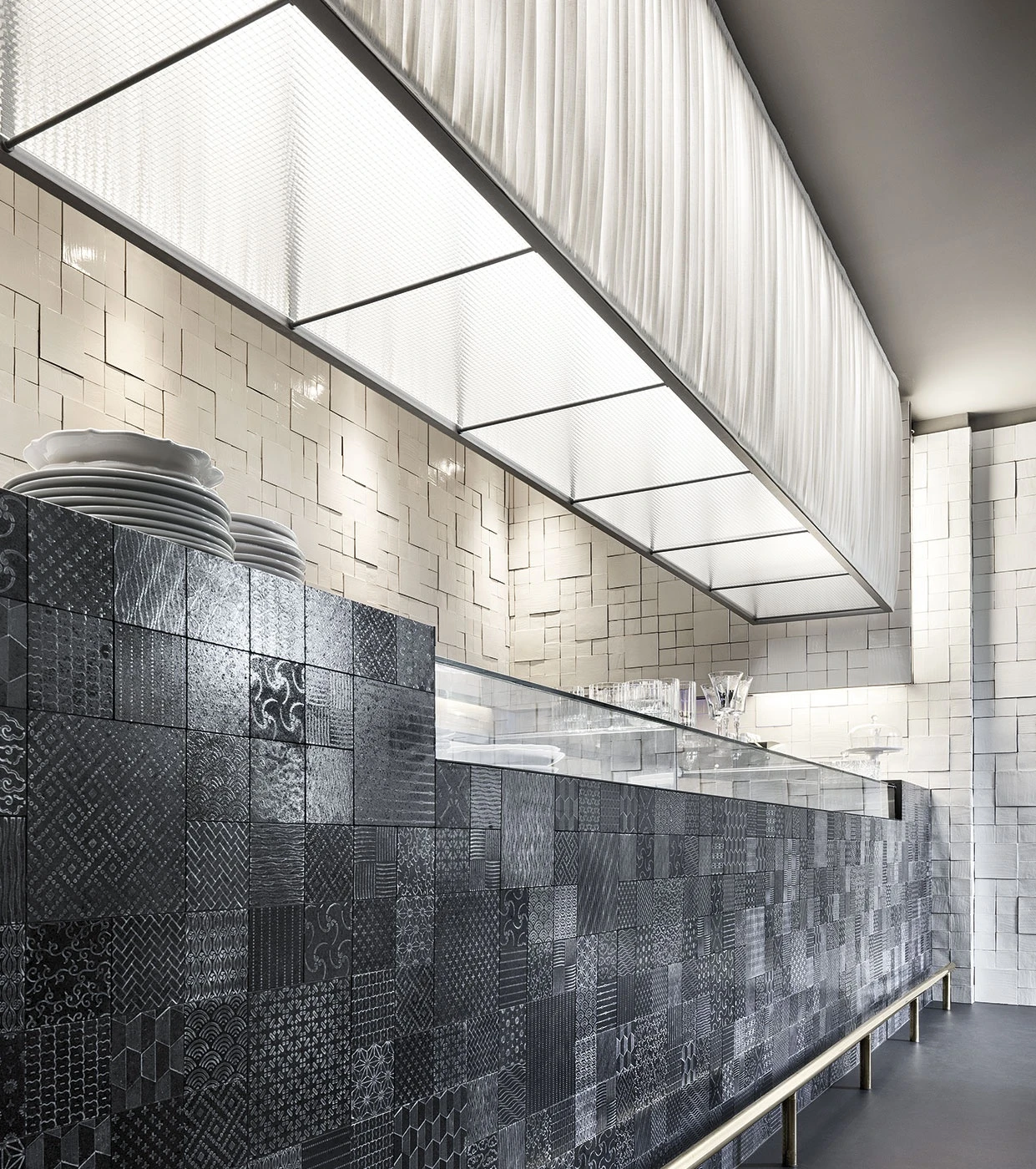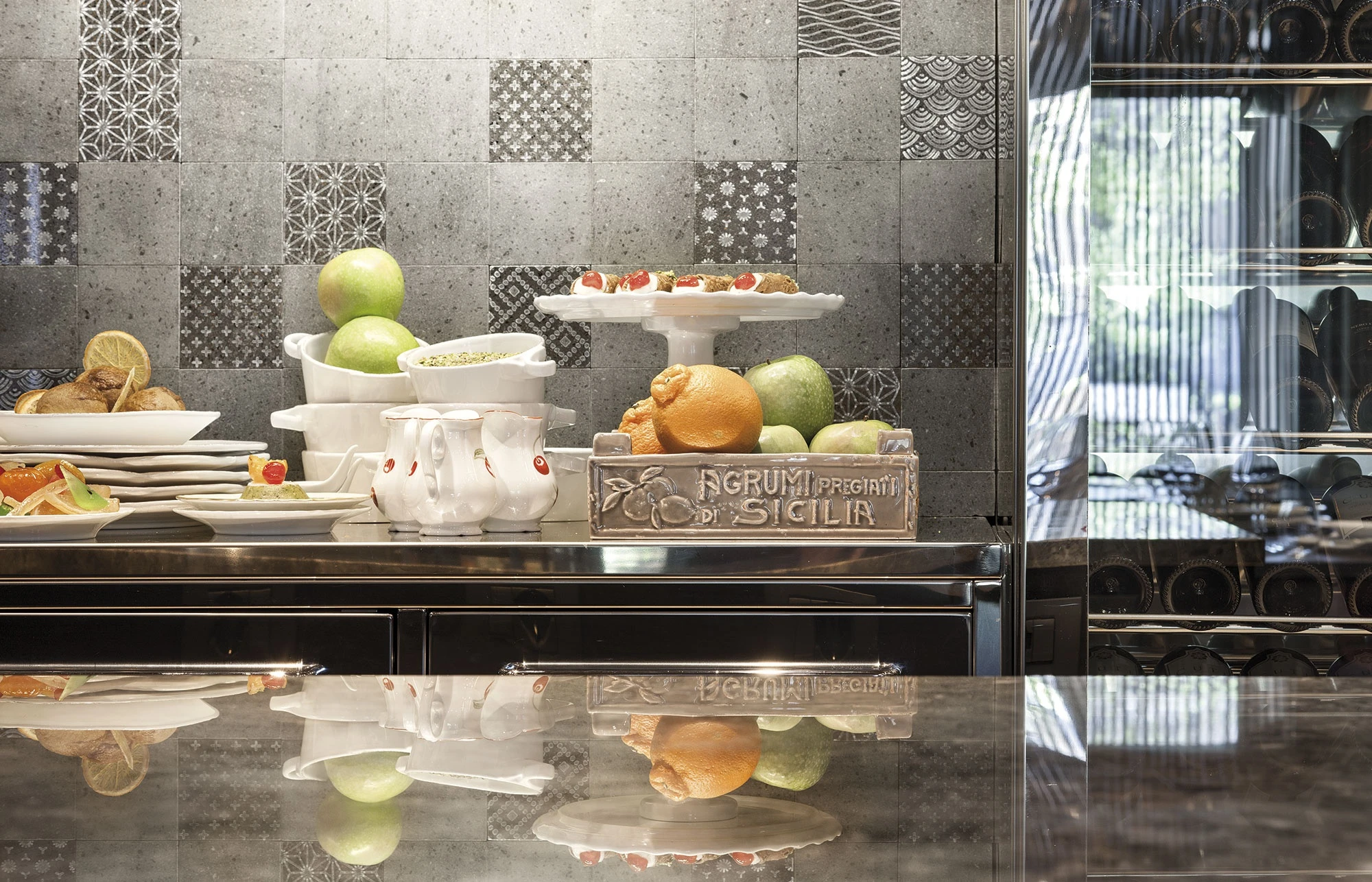 The space extends for 1800 sqm over two floors in a multi-ethnic atmosphere that radiates a Mediterranean air. Guests enter from the beautiful piazza Risorgimento into the luminous Day Bar, the space defined by walls covered in white, hand-made ceramic tiles, large glass windows framing the piazza and a counter clad in volcanic stone featuring white decorative carvings reminiscent of embroidery.