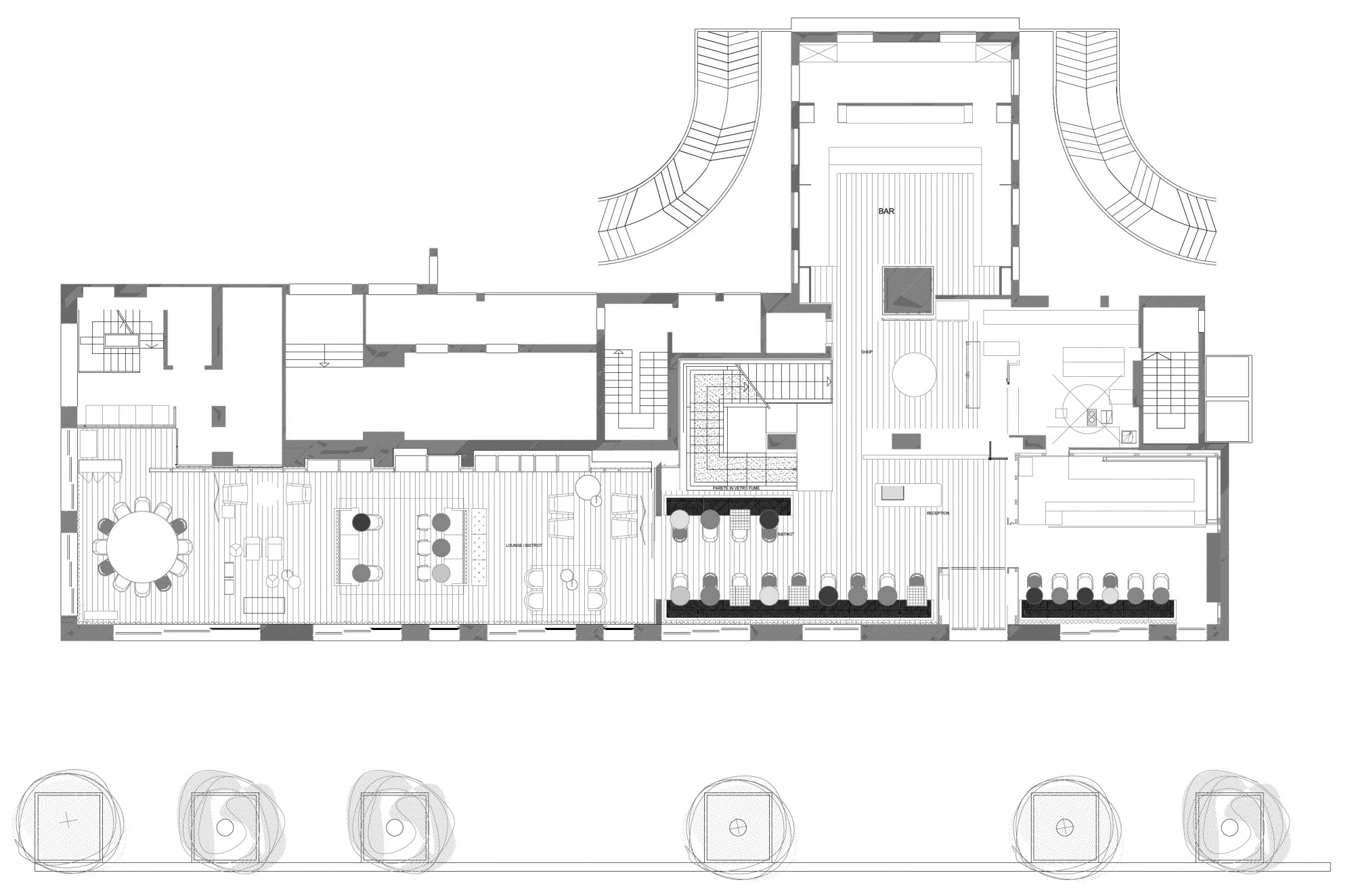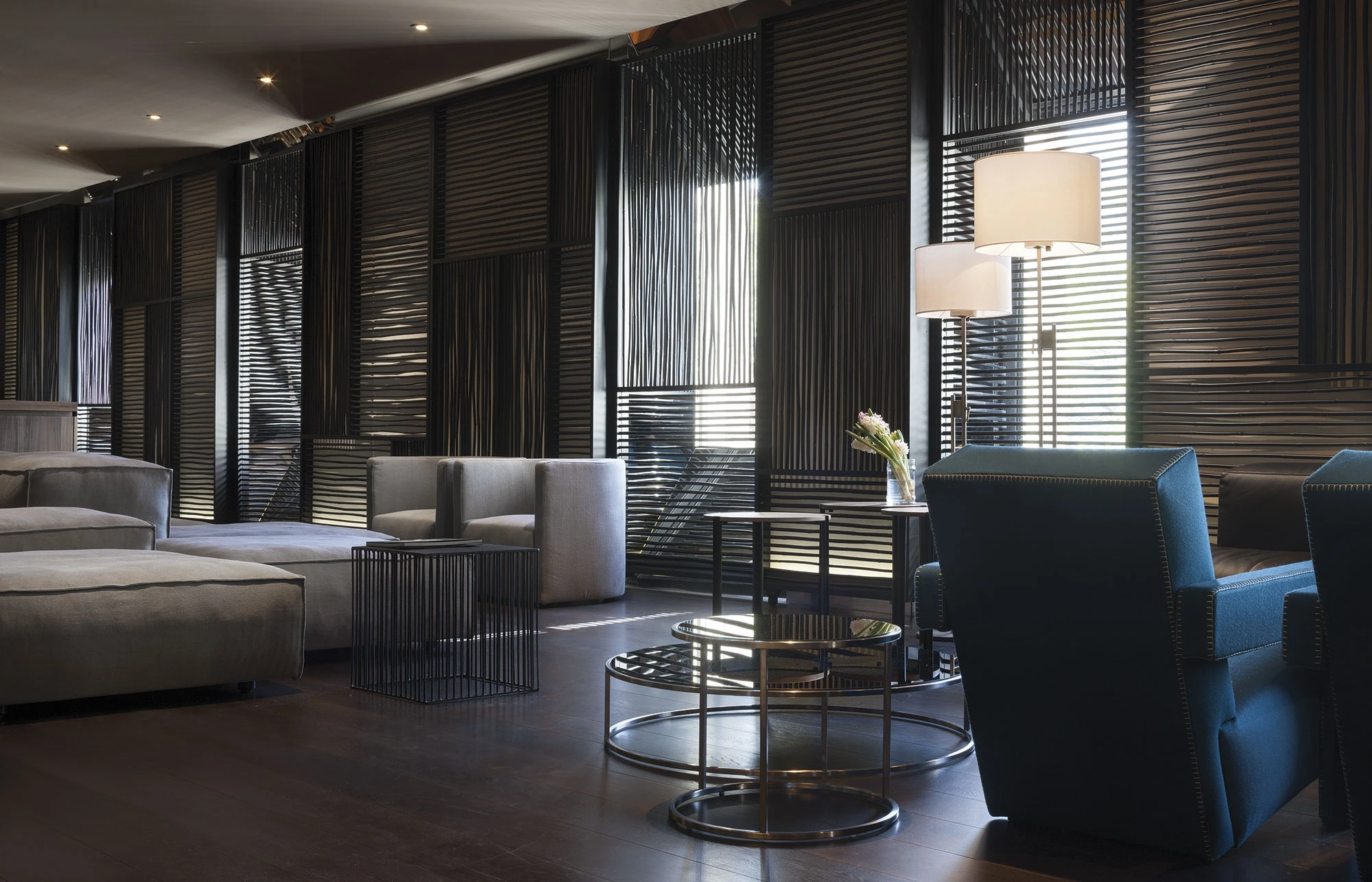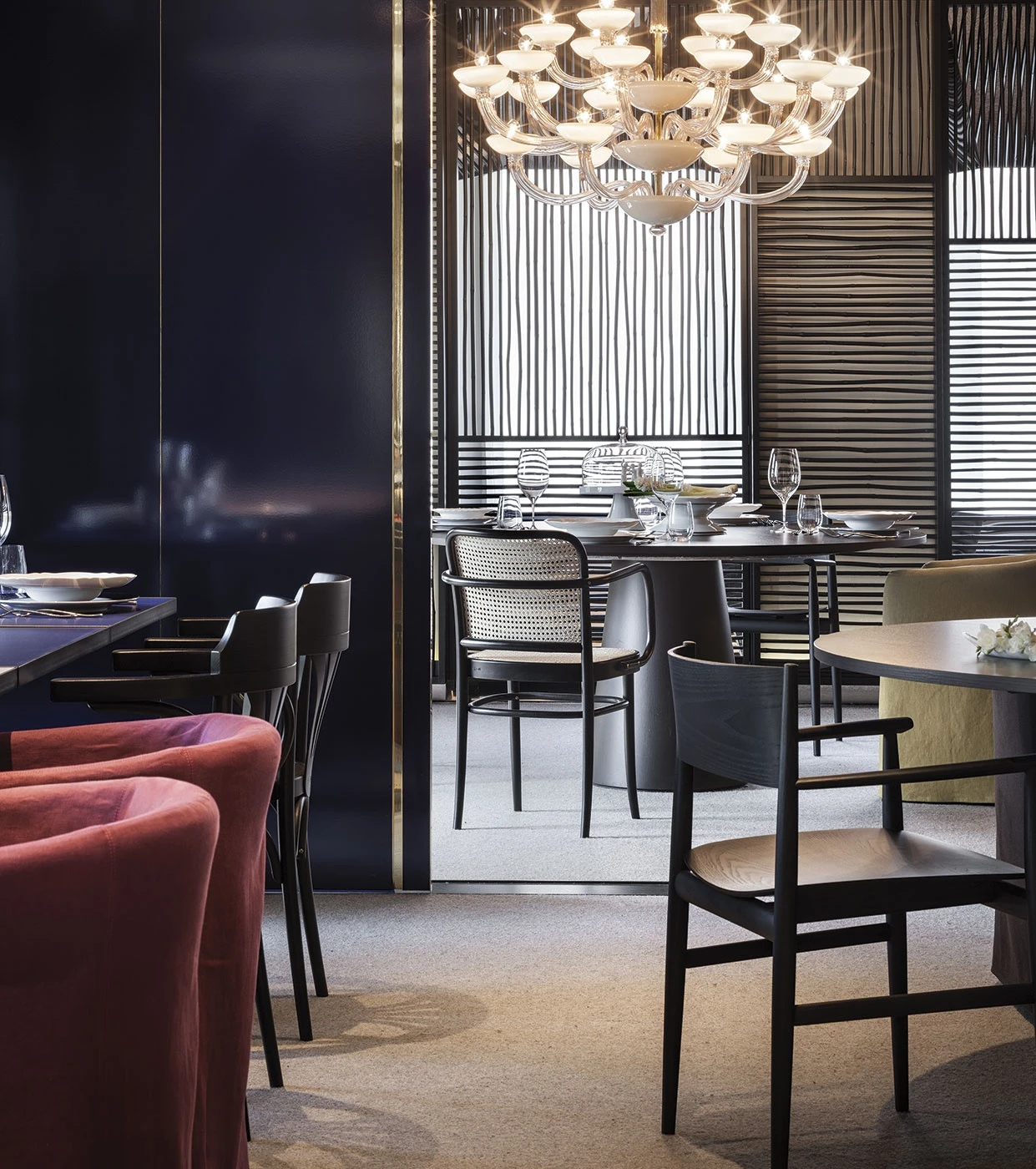 The first floor reveals another space conceived as a series of diverse but fluid areas, devoid of architectural barriers. Warm and enticing areas composed of sofas and armchairs fill the remainder of the lounge up to the restaurant, where 70 seats are distributed around tables of various shapes and sizes. The space concludes with two large round tables illuminated by a pair of Murano glass chandeliers, which can become a private area thanks to a system of sliding doors.