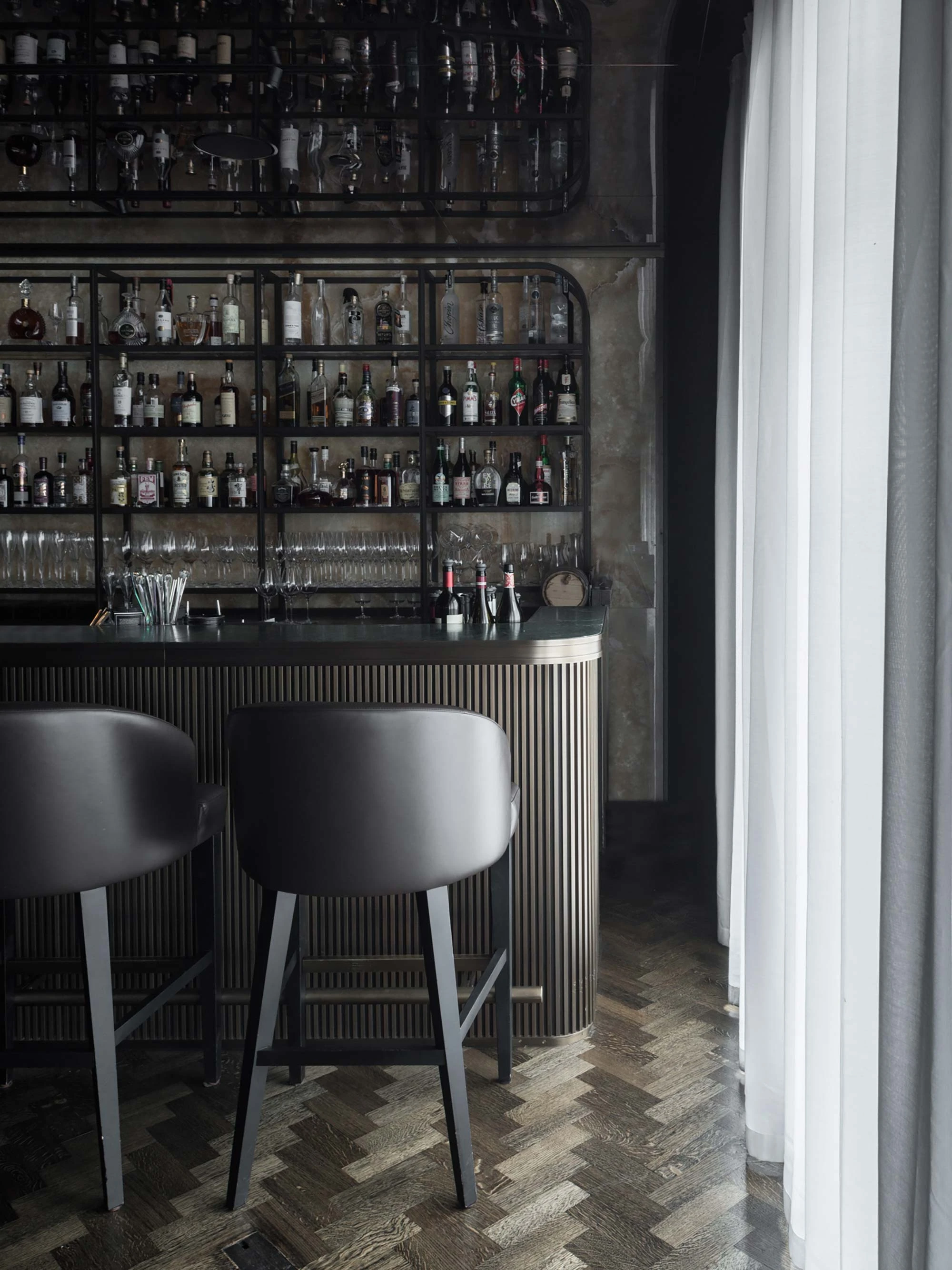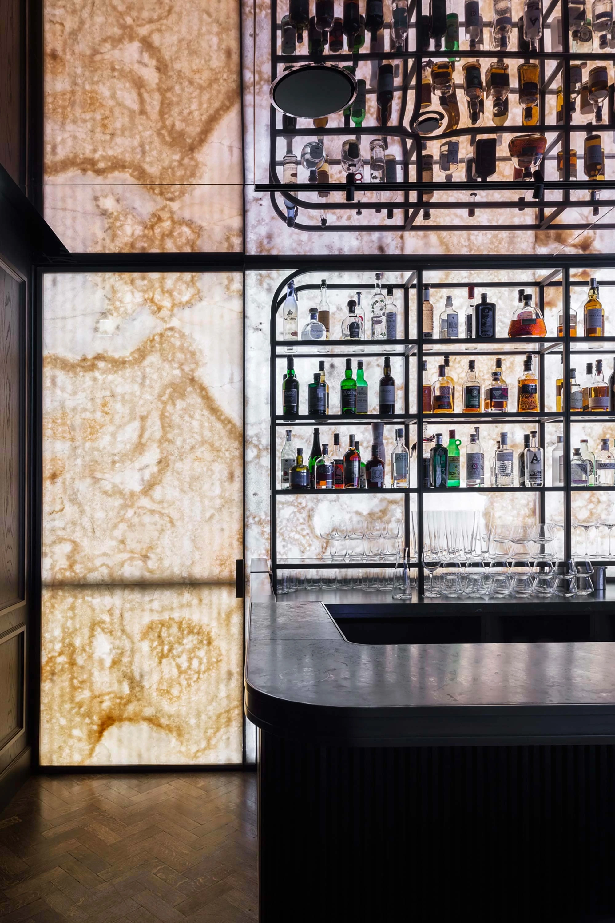 The lobby becomes a voluminous space, taking advantage of its double height. Passing through the sushi bar on the floor above and exiting right, one arrives at the restaurant Laurent at Café Royal, distinguished by an illuminated wall for storing and displaying bottles and through which the kitchen and grill can be glimpsed. Situated along the gallery that delimits the perimeter of the lobby, the restaurant is an informal but sophisticated environment featuring a show kitchen.