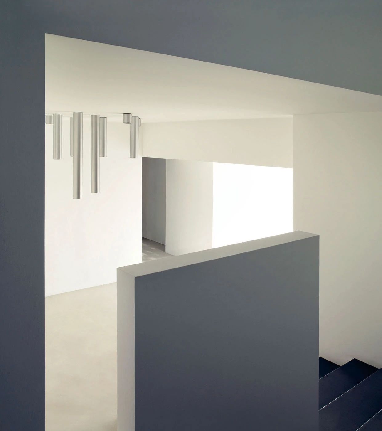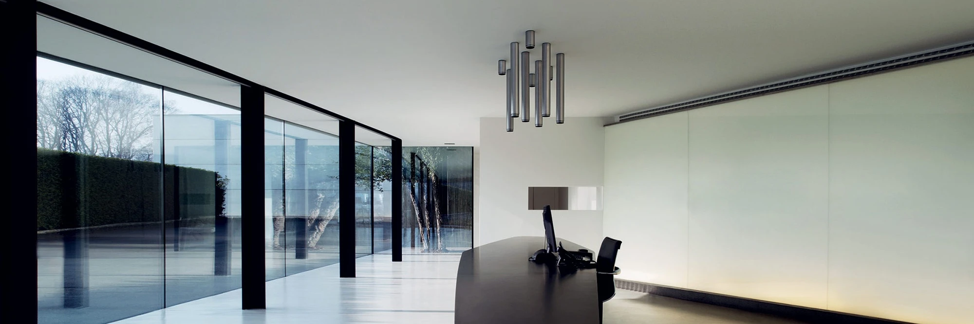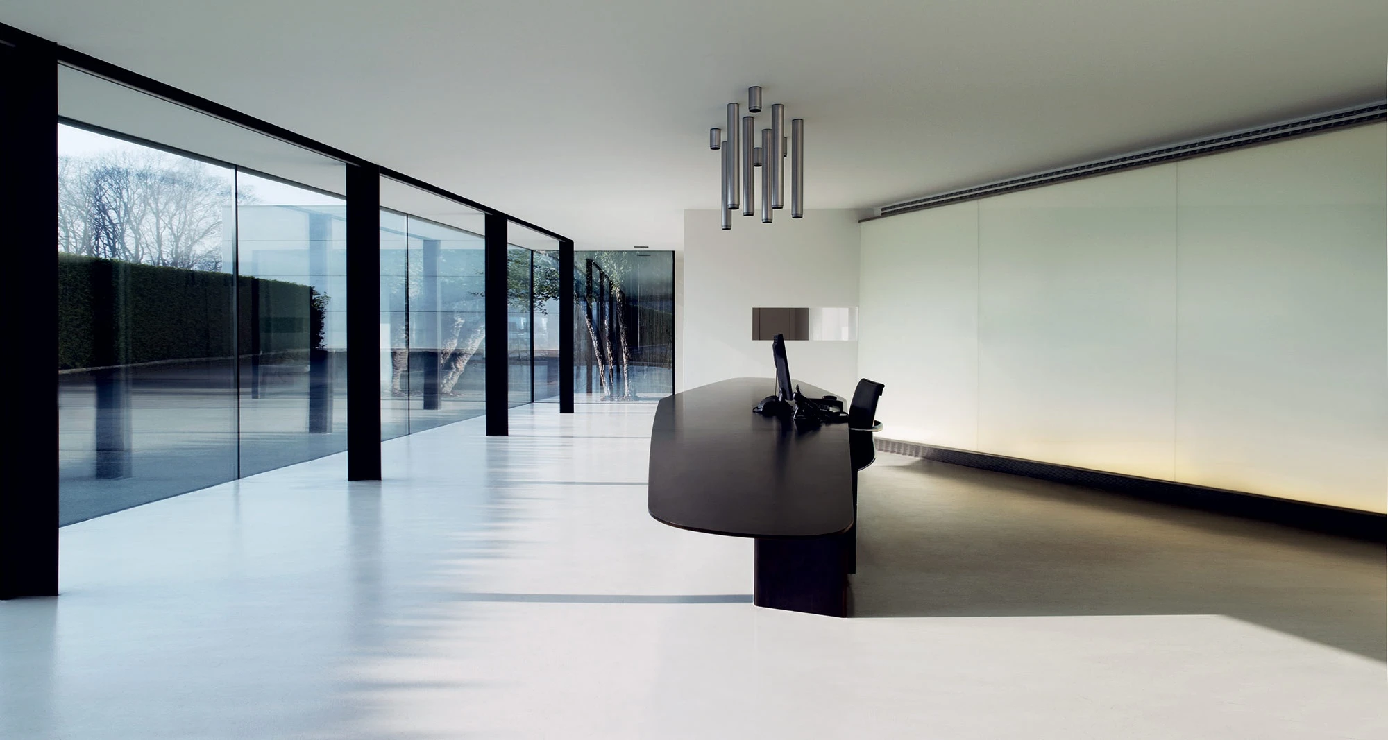 In 1999, Lissoni began working on plans to expand the existing Boffi's headquarters and plant located in the northern Italian city of Lentate sul Seveso. The main aim was to establish a paint shop, security area, warehouse and reception area. The first building phase produced the reception area, which was finished in April 2008. The glass-encased, puristic steel construction was added directly onto the old building. The roof and narrow base are flush with the large glass windows on the sides, and these two components extend past the windows on the right and thus form a sheltered entrance area that is also marked by a large red arrow. Visitors are welcomed at a massive and heavy table made of six welded metal plates which is placed in front of a glass wall within this indirectly lit entry area.