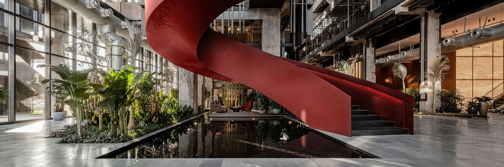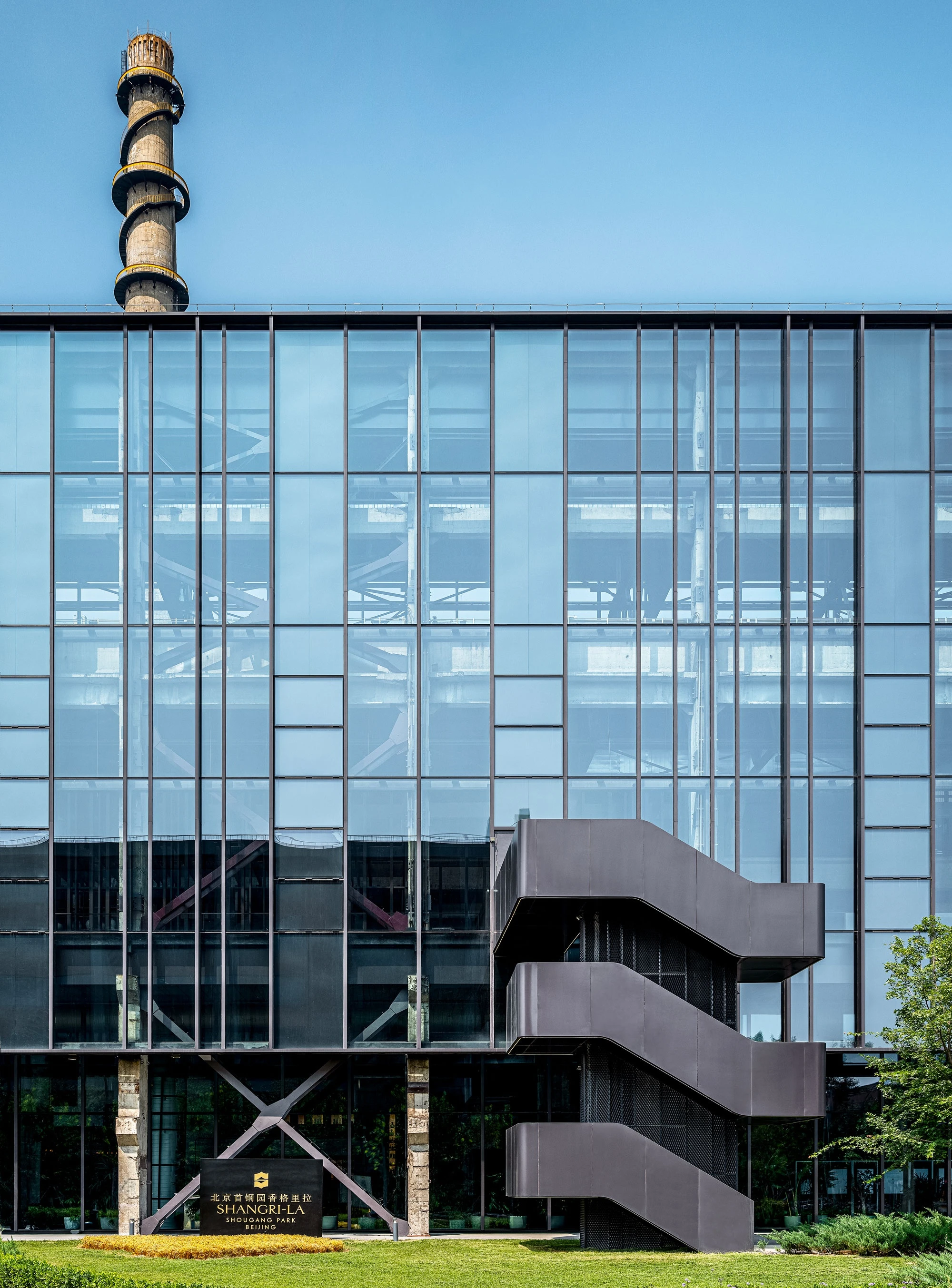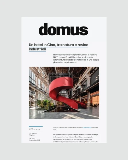 The hotel is constructed within an abandoned industrial area and was inaugurated on the occasion of the Beijing Winter Olympics. The entire complex, named Shougang Park, is around 20 km from the Forbidden City and is where many of the Game’s sports venues are situated. The 5-star hotel managed by Shangri-La (Shougang Group) includes a series of interconnected structures divided between the Main Building housing the common areas and the Guestrooms Building that will accommodate 282 rooms.