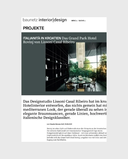 The studio developed the interior design of the rooms and all the public areas, including those along the seafront which connect the new structure to the historic centre of Rovinj. The hotel comprises 2 reception areas, 193 rooms and 16 suites, 2 restaurants, 1 pool bar, 1 spa extending over 3800 sqm, 1 lobby bar, 3 pools (2 external and 1 internal) and the conference area. Realized in collaboration with the Architecture Studio 3LHD from Zagreb, the Grand Park Hotel Rovinj has been designed as a leisure hotel and extends over 6 levels, all completely integrated into the hillside and surrounding vegetation. The spacious lobby is the heart of the project, providing access to the two-story, all-day restaurant and the terrace, the latter enjoying a unique view of the city of Rovinj. Together with the stylist Carlos Baker, Lissoni Graphx designed the staff uniforms, from the general manager to the waiters, from the receptionist to the porter, from the pool boy to the staff of the wellness centre.