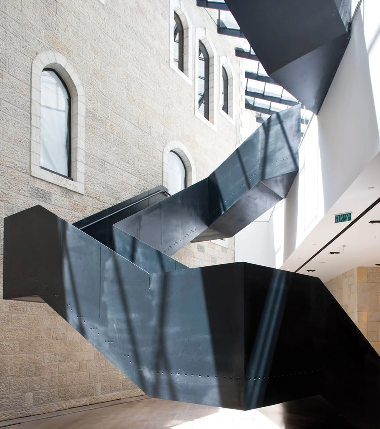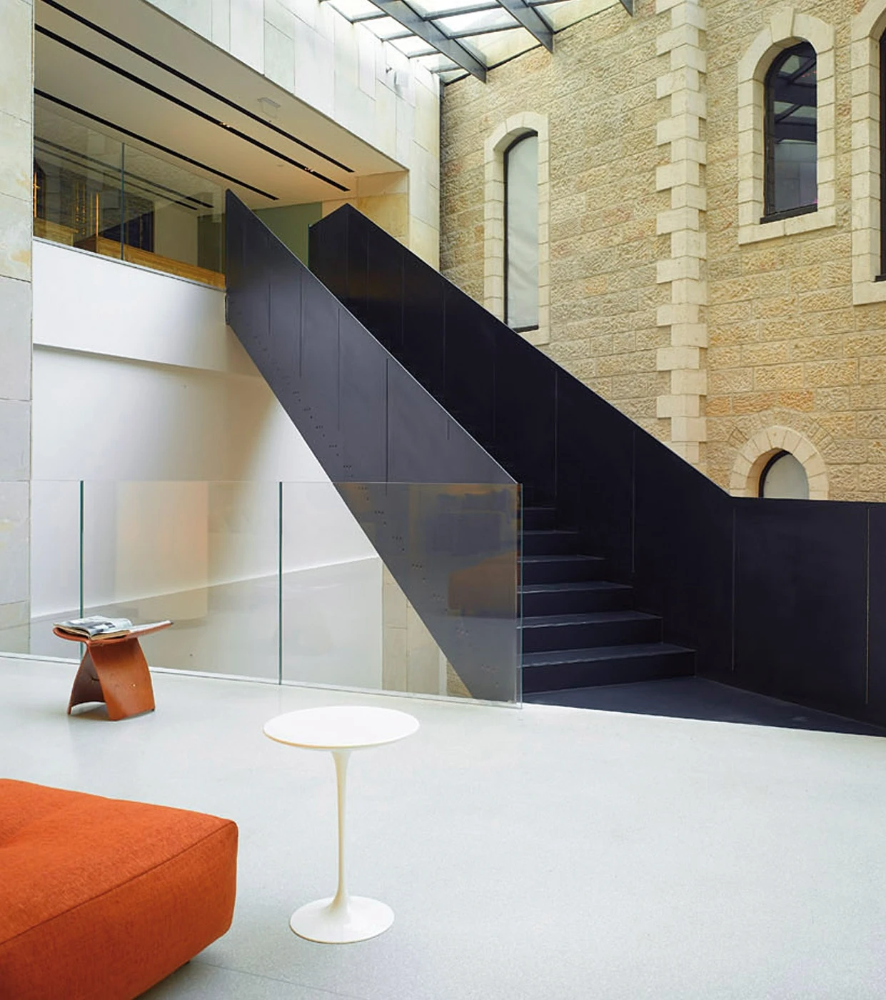 The approximately 15,400 square meter Mamilla Hotel extends for eight stories. Piero Lissoni was responsible for overseeing the complete interior design of the guestrooms and suites, bars, restaurants, lobby and spa. (ha senso metterlo in architettura?) The design concept placed great emphasis on the lighting in combination with contemporary furniture and state of the art acoustics. The hotel consists of an old and a new structure and is closely connected with the history of Jerusalem. The old section was reconstructed using the old stones of the historic building that previously occupied the site. This natural and resilient stone and thus also the warm, sandy colours of Jerusalem carry through the entire hotel, with the atmosphere further enhanced by historic maps of the city decorating the walls.
