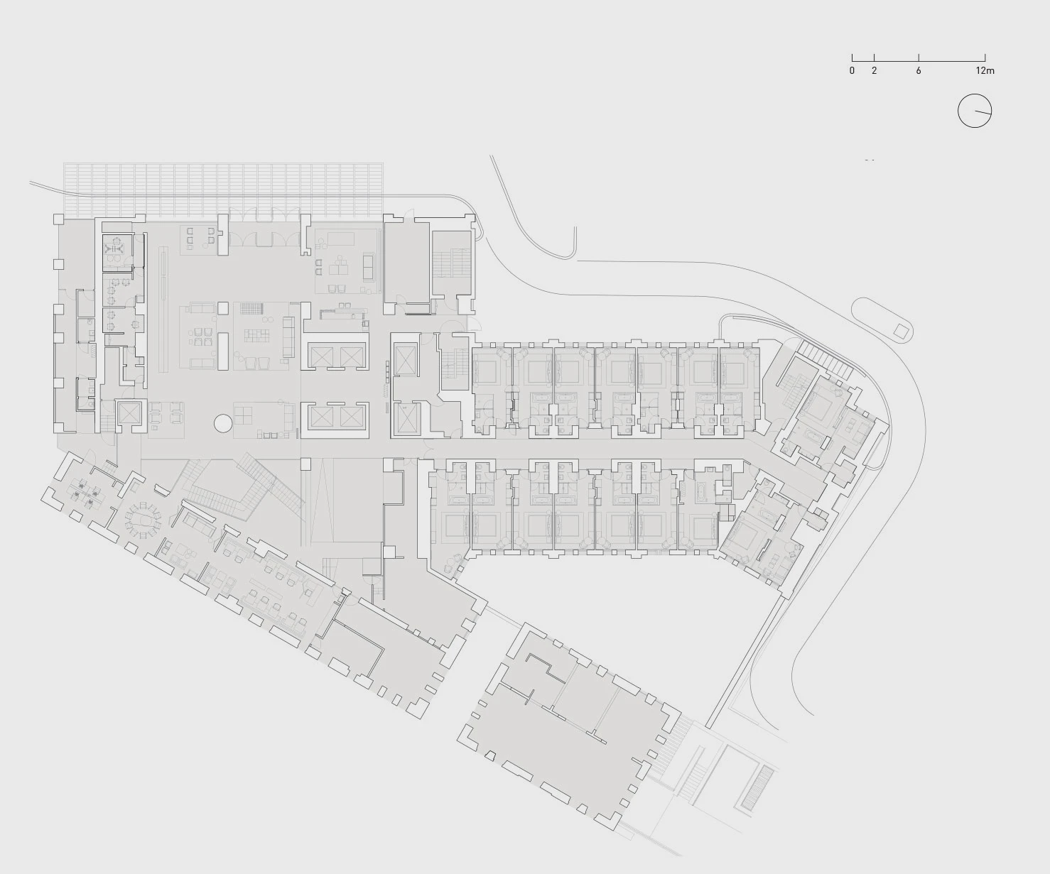 The 210 rooms, along with the public areas, are distributed over the building’s eight floors above ground and the two below. The main architectural component is the untreated sheet steel staircase, resembling a giant origami sculpture.