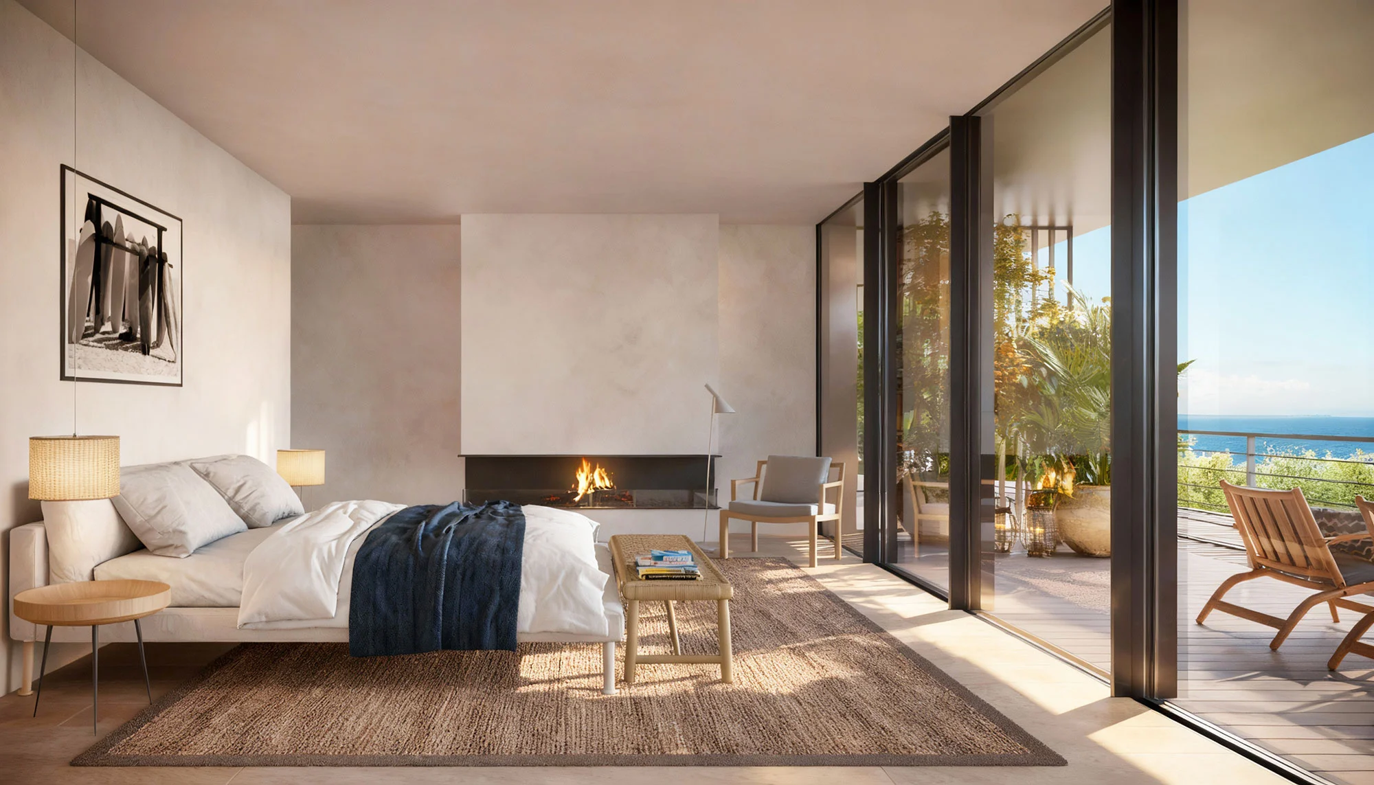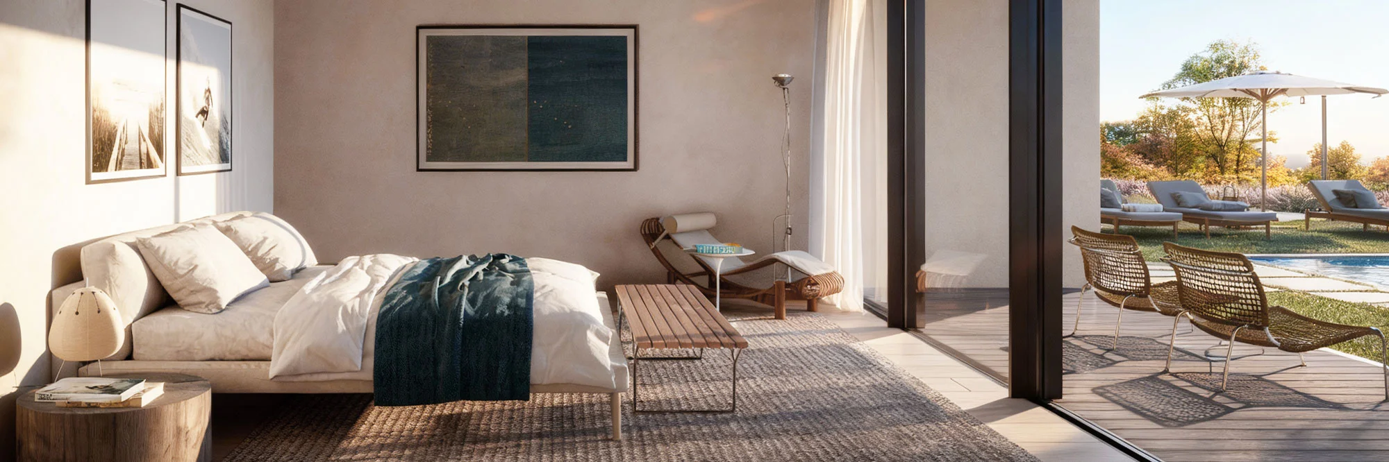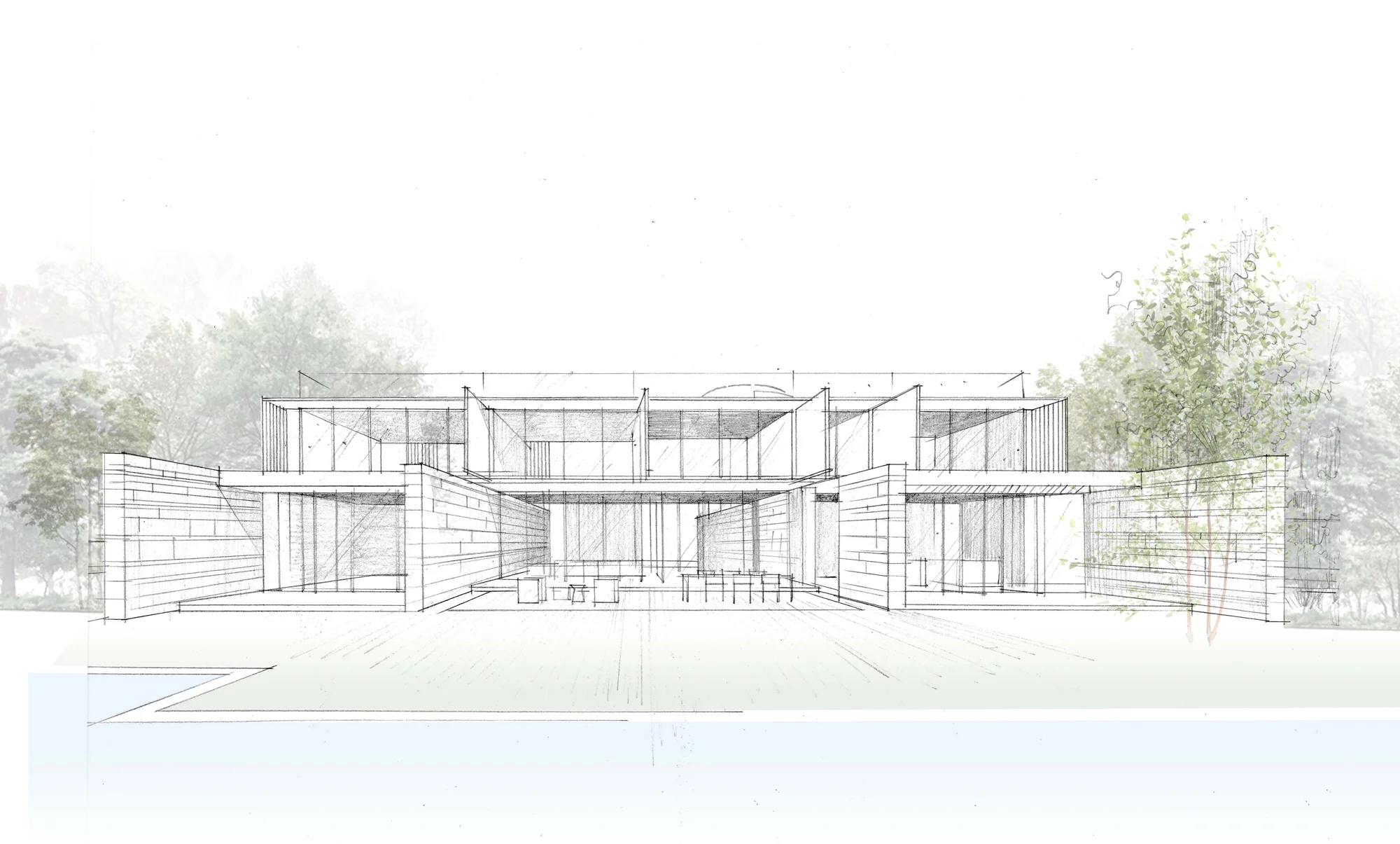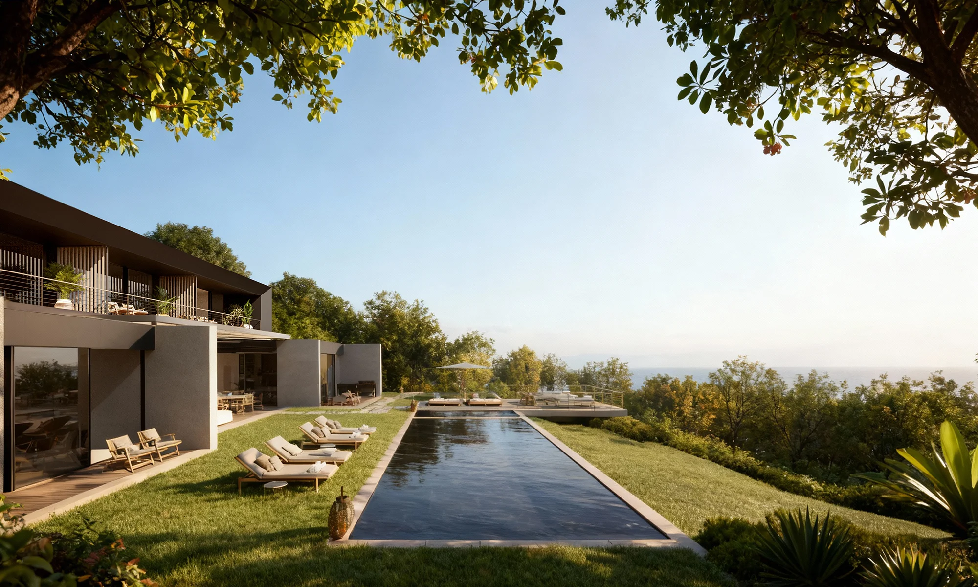 The continuity of materials and finishes, extending seamlessly from indoor to outdoor surfaces, produces a unified architectural expression that blurs the threshold between the built environment and nature. Natural tones, tactile textures, and expansive glazing emphasize transparency and connection, framing the landscape as an essential component of the architectural experience.