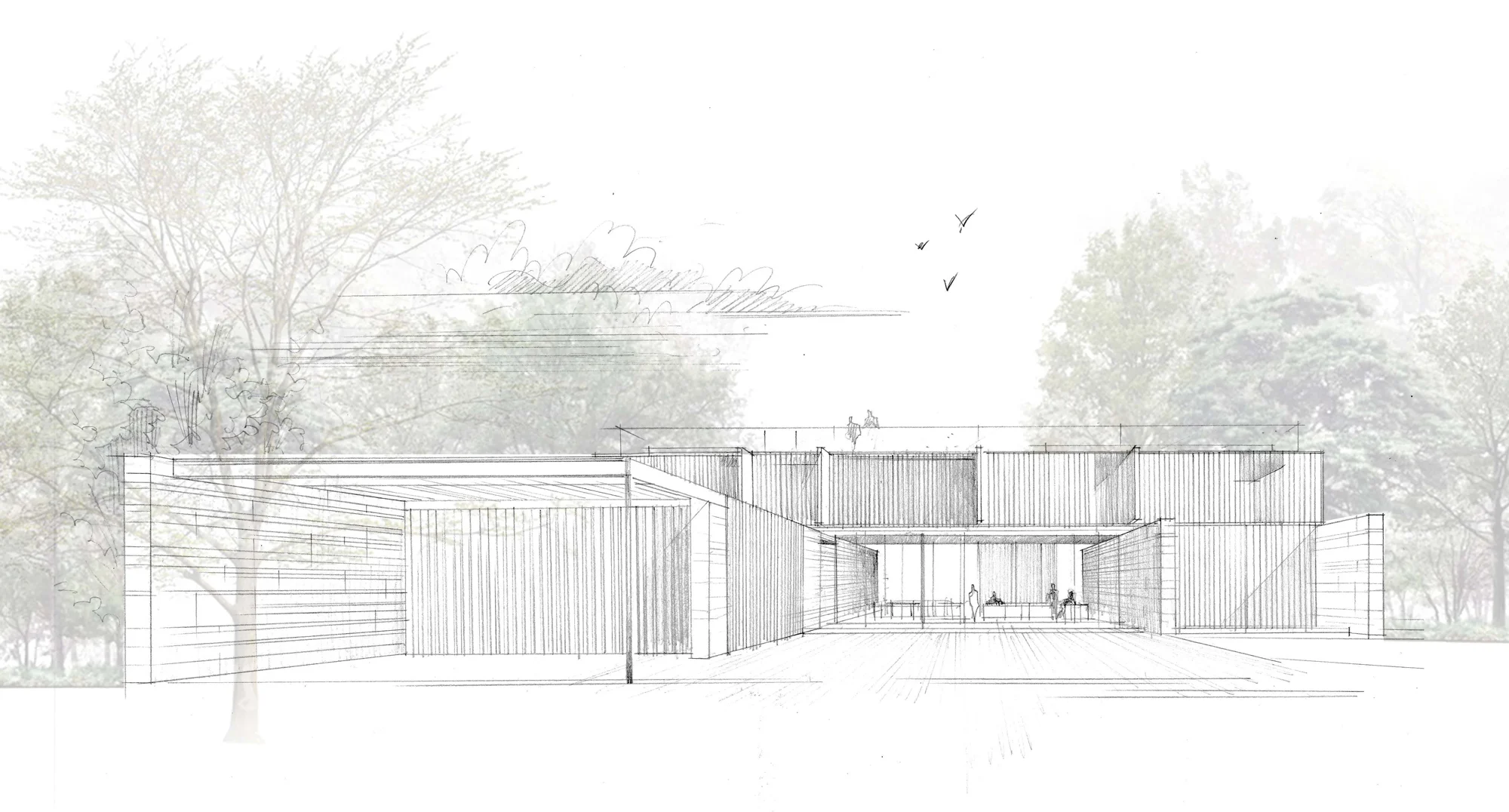 The design language is characterized by a composition of interlocking and overlapping volumes in timber and lime plaster, generating a sequence of voids, terraces, and cantilevers that create fluid transitions between interior and exterior spaces.