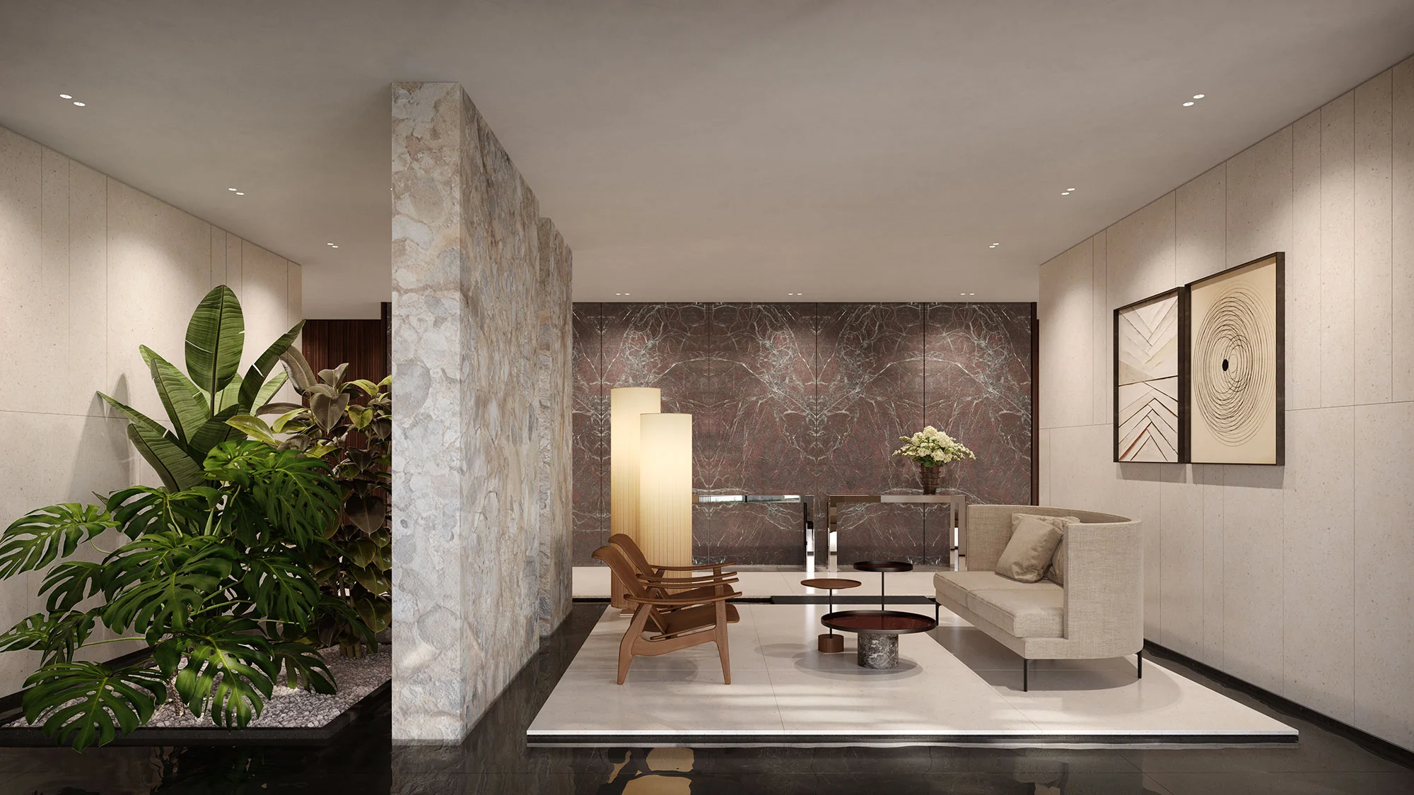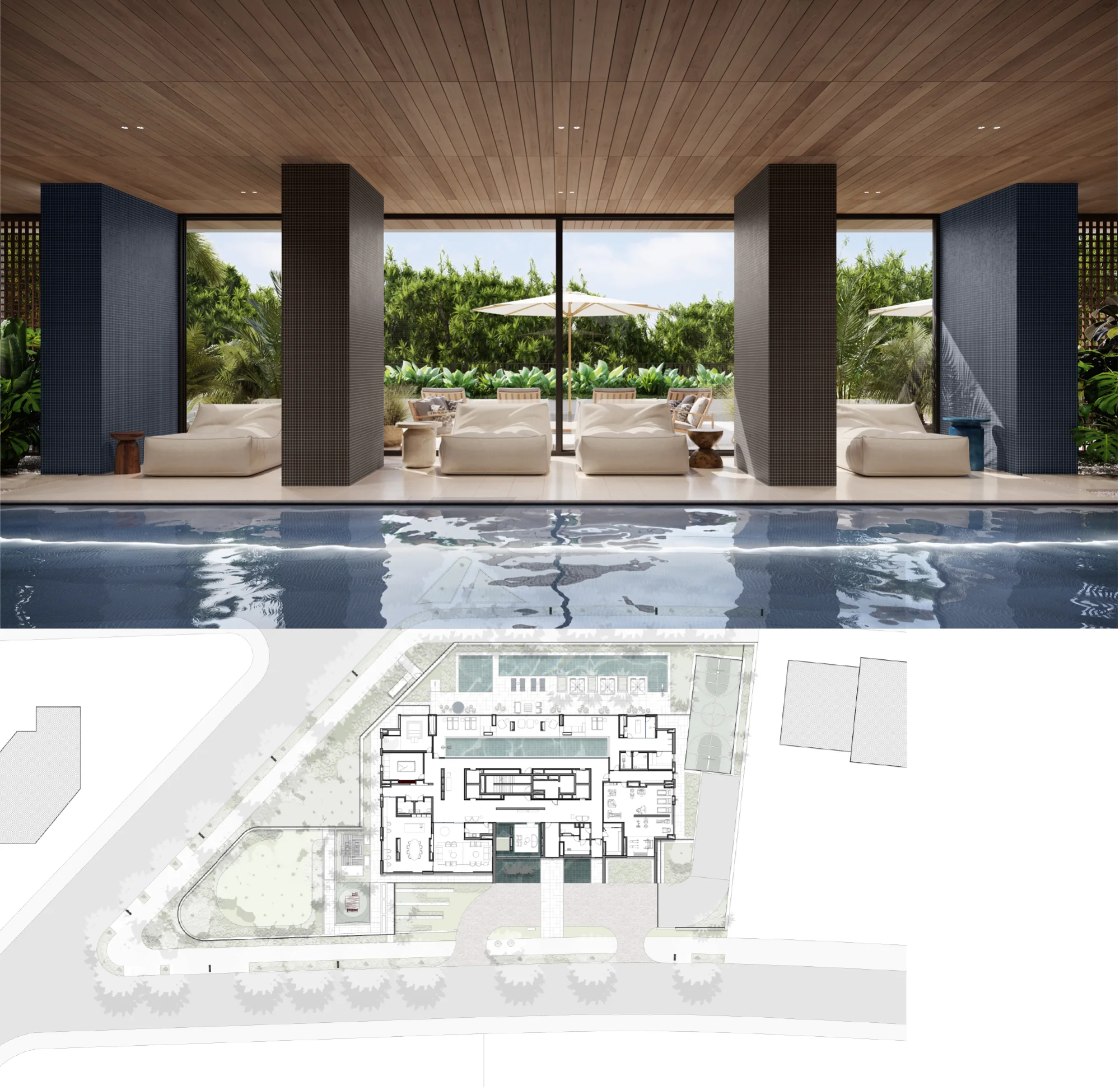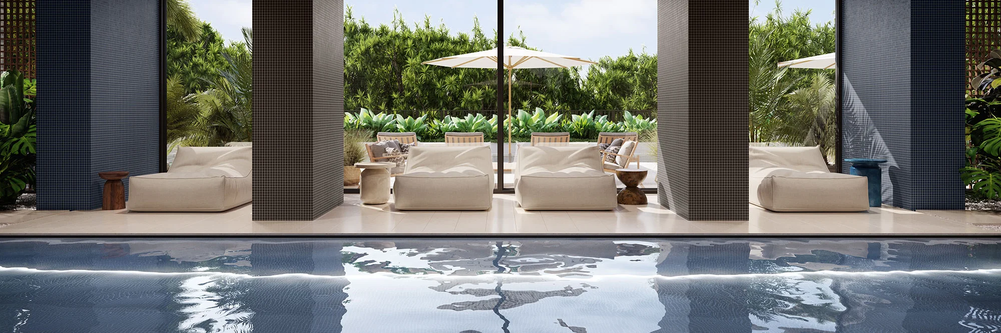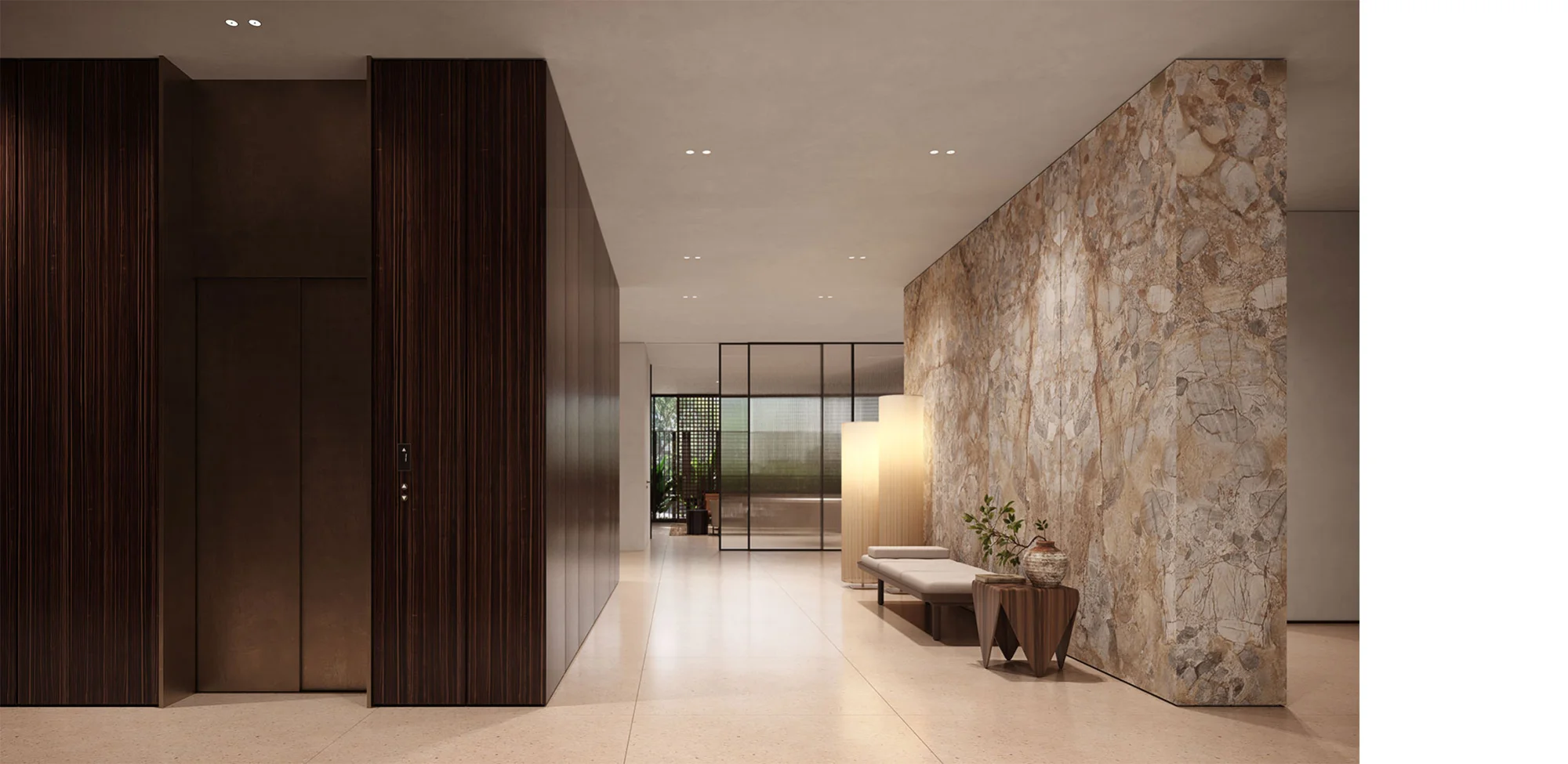 At ground level, a carefully structured arrival sequence introduces the shared amenities and outdoor spaces, conceived to encourage community while preserving a strong sense of exclusivity. The podium becomes the social heart of the development, hosting a wide range of leisure and wellbeing areas, including extensive gardens, lounge settings, as well as extensive water features that connect the different spaces by cultivating a calming and restful ambiance.