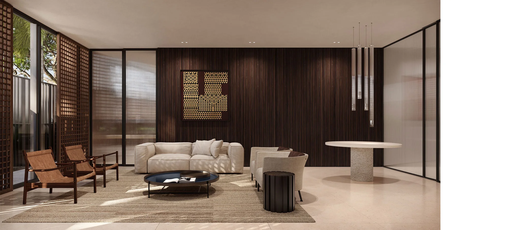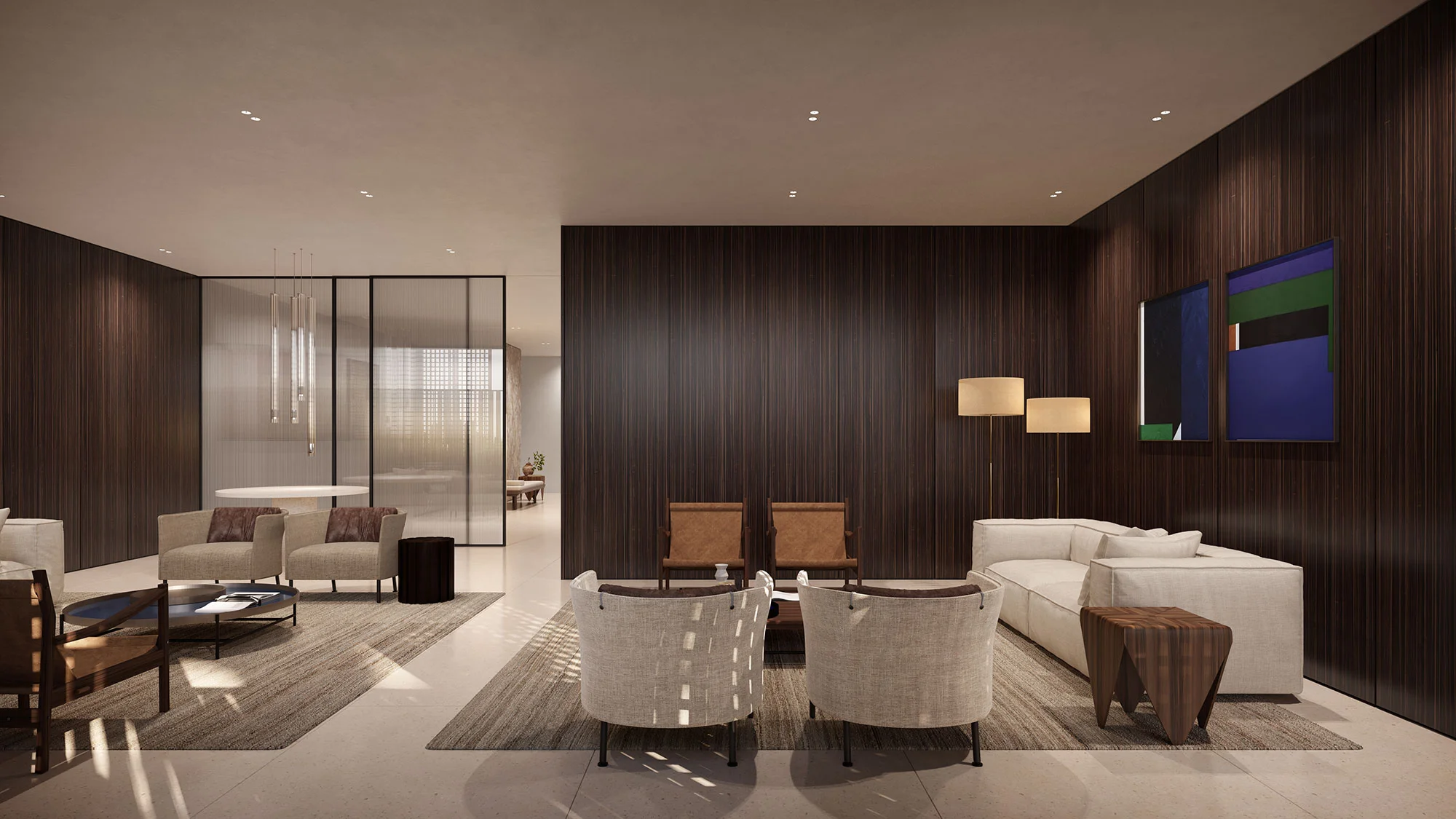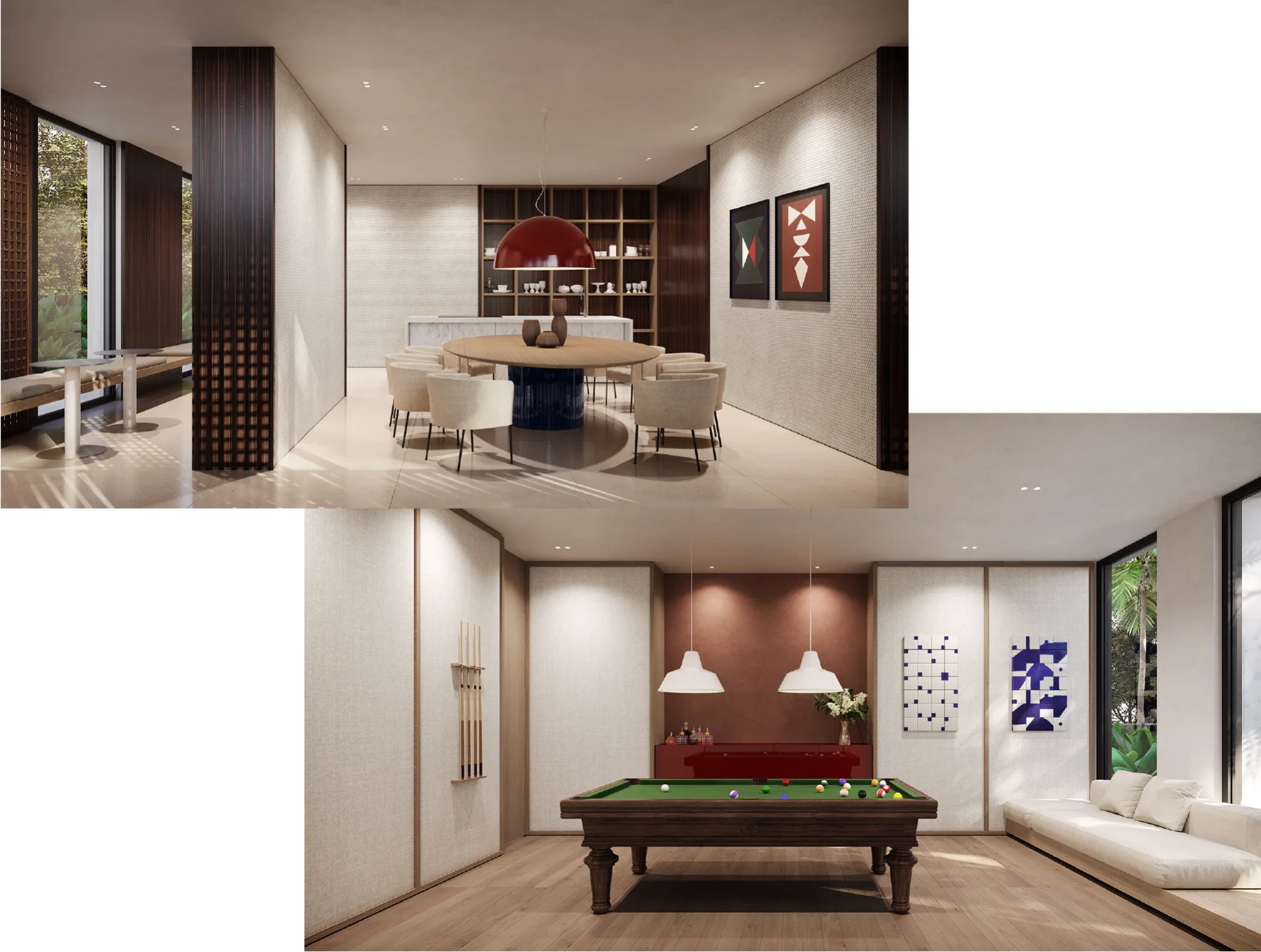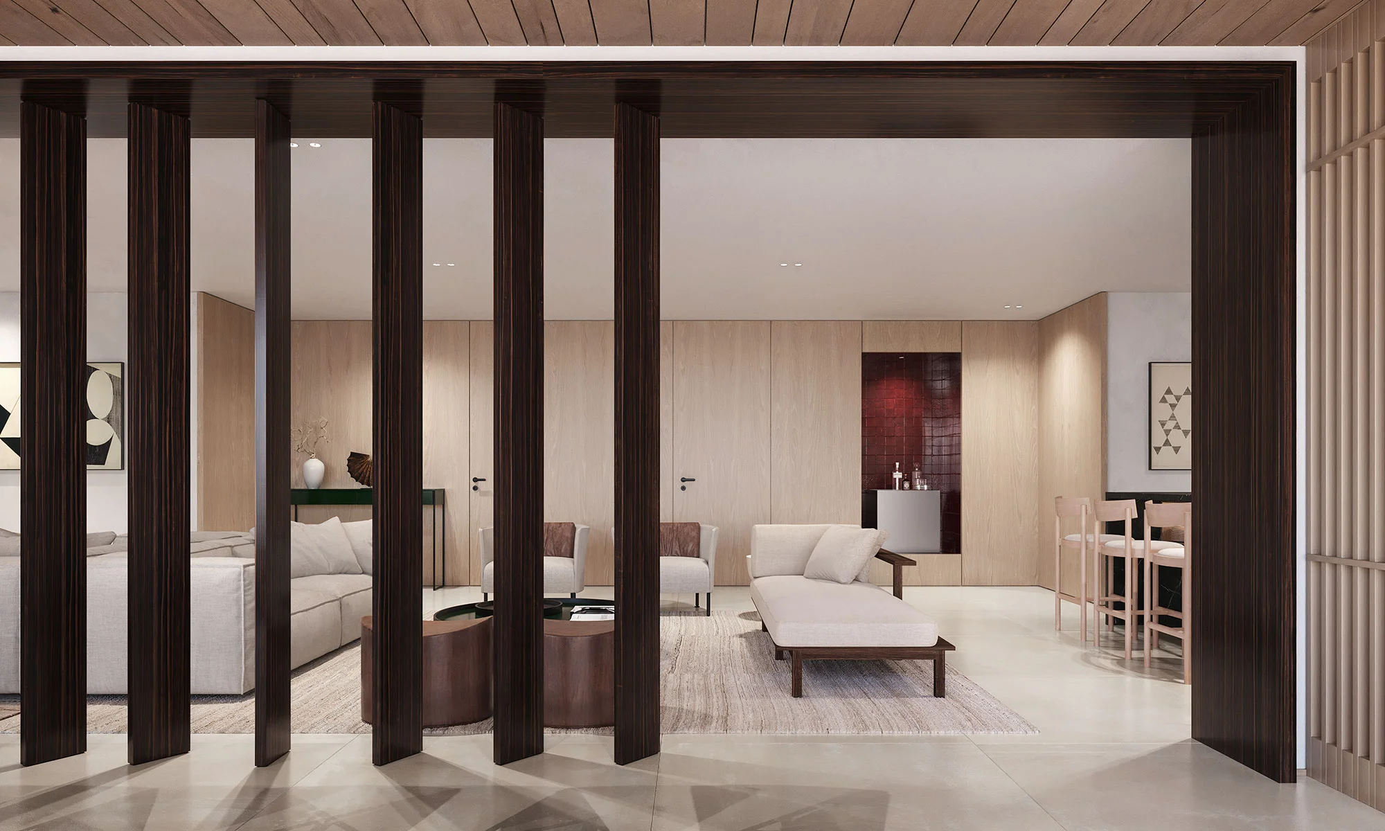 At ground level, a carefully structured arrival sequence introduces the shared amenities and outdoor spaces, conceived to encourage community while preserving a strong sense of exclusivity. The podium becomes the social heart of the development, hosting a wide range of leisure and wellbeing areas, including extensive gardens, lounge settings, as well as extensive water features that connect the different spaces by cultivating a calming and restful ambiance.