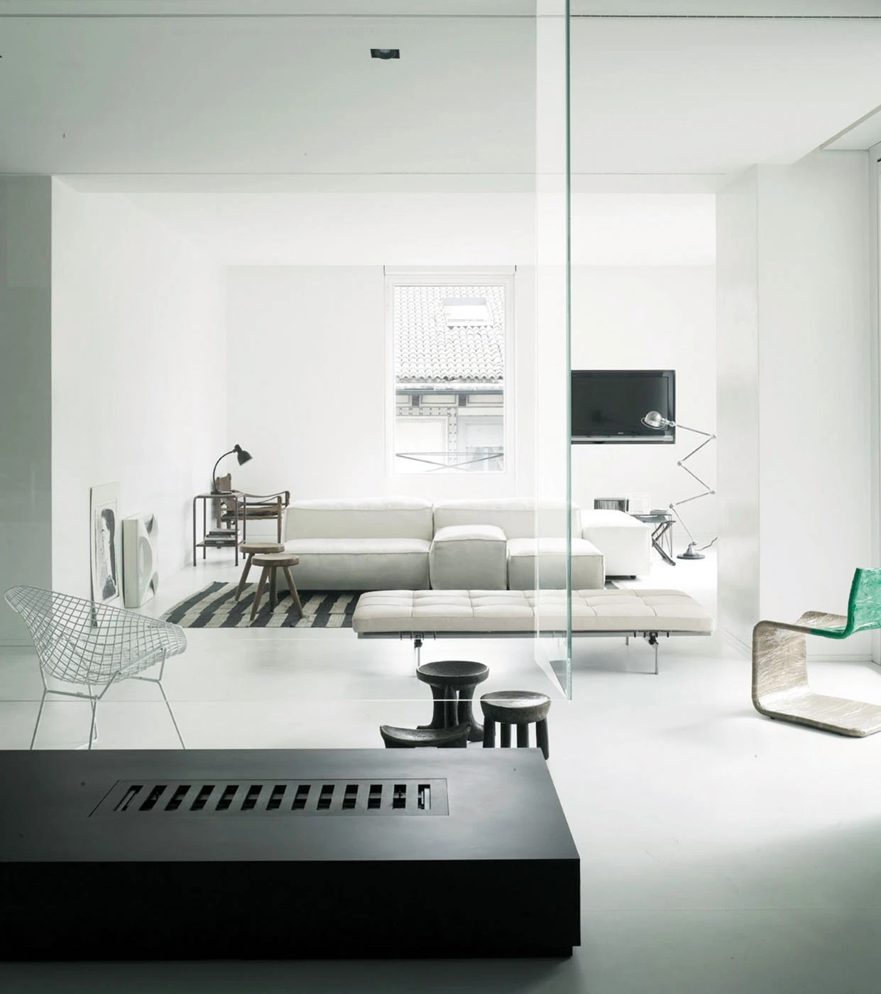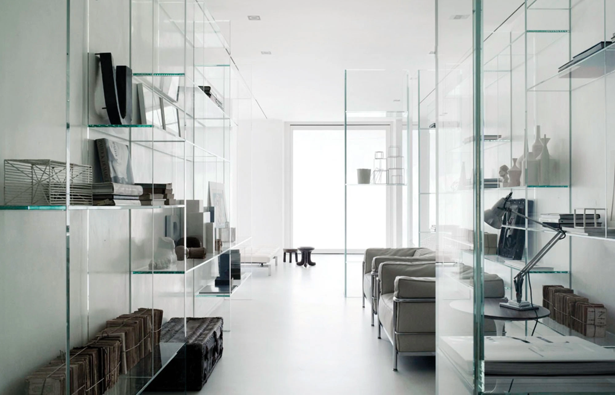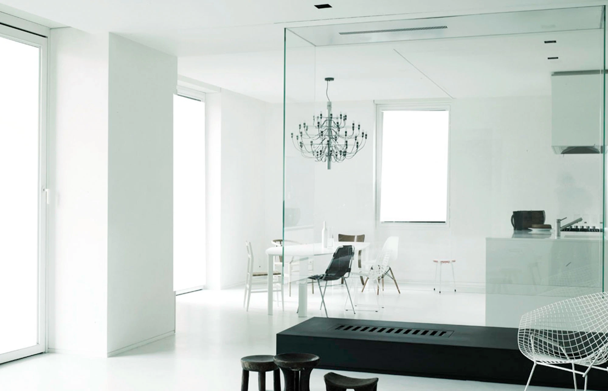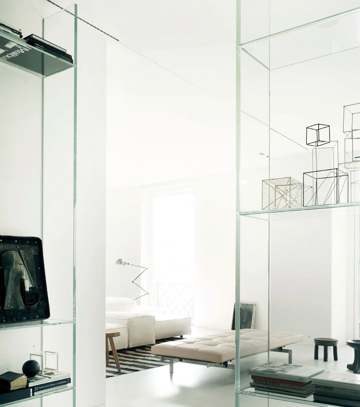 With very modern furniture and well chosen accessories set against an all-white backdrop, this Milanese interior is peaceful, understated and effortlessly chic. Many of the key pieces in the apartment, such as the glass shelving in the entrance, are bespoke handcrafted items designed by Lissoni.