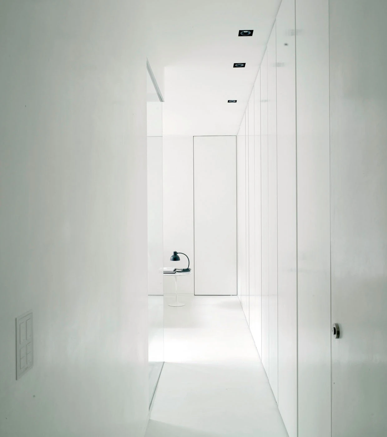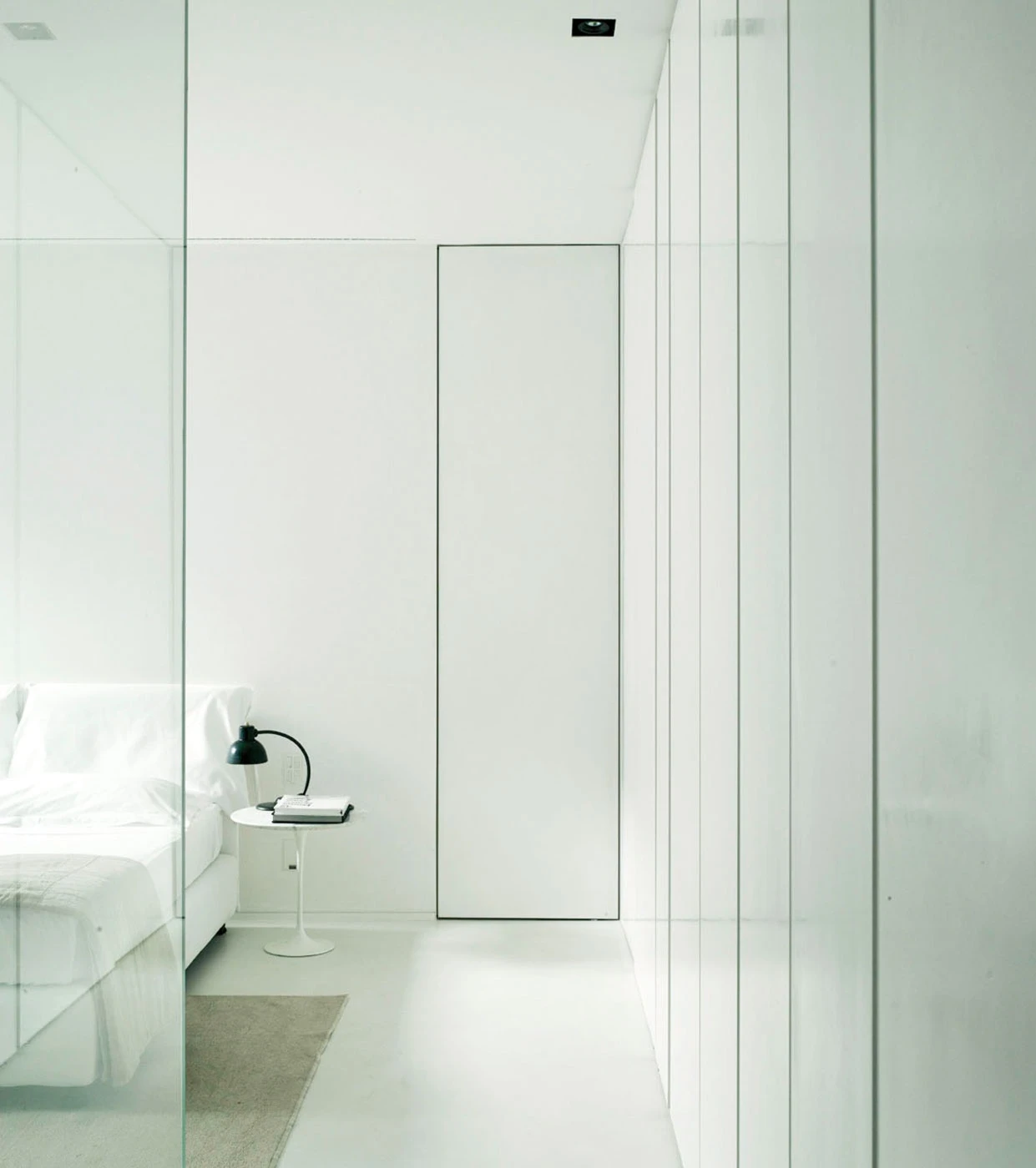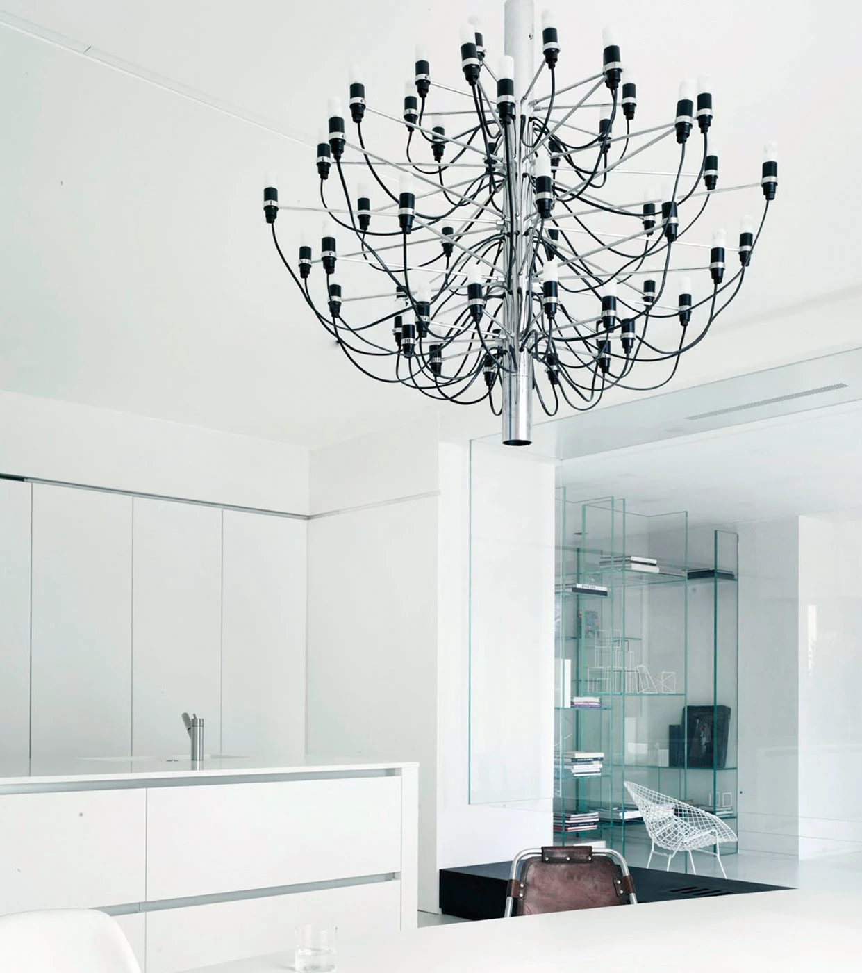 With very modern furniture and well chosen accessories set against an all-white backdrop, this Milanese interior is peaceful, understated and effortlessly chic. Many of the key pieces in the apartment, such as the glass shelving in the entrance, are bespoke handcrafted items designed by Lissoni.