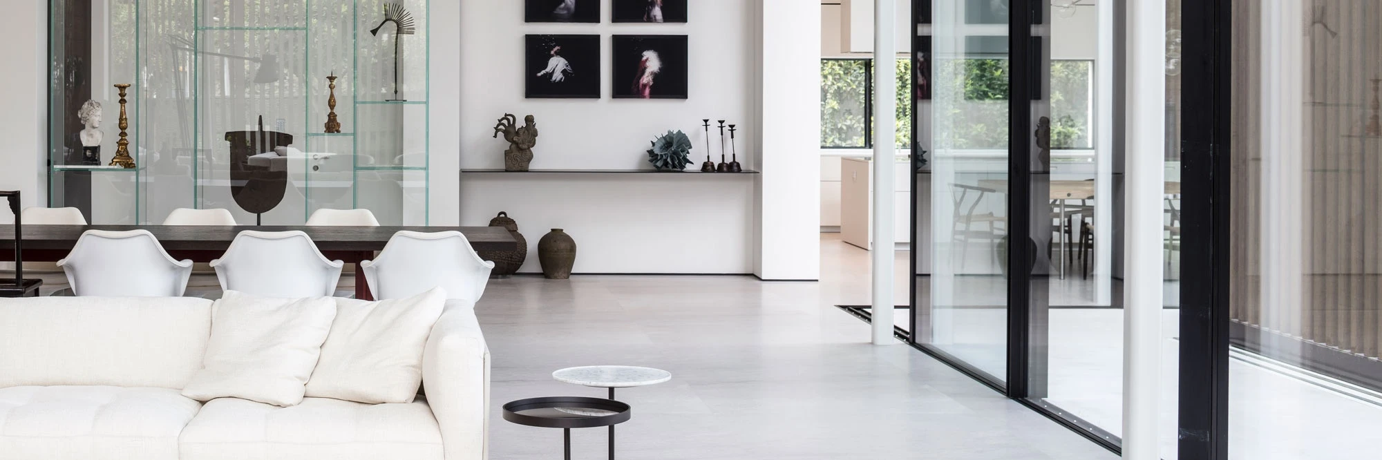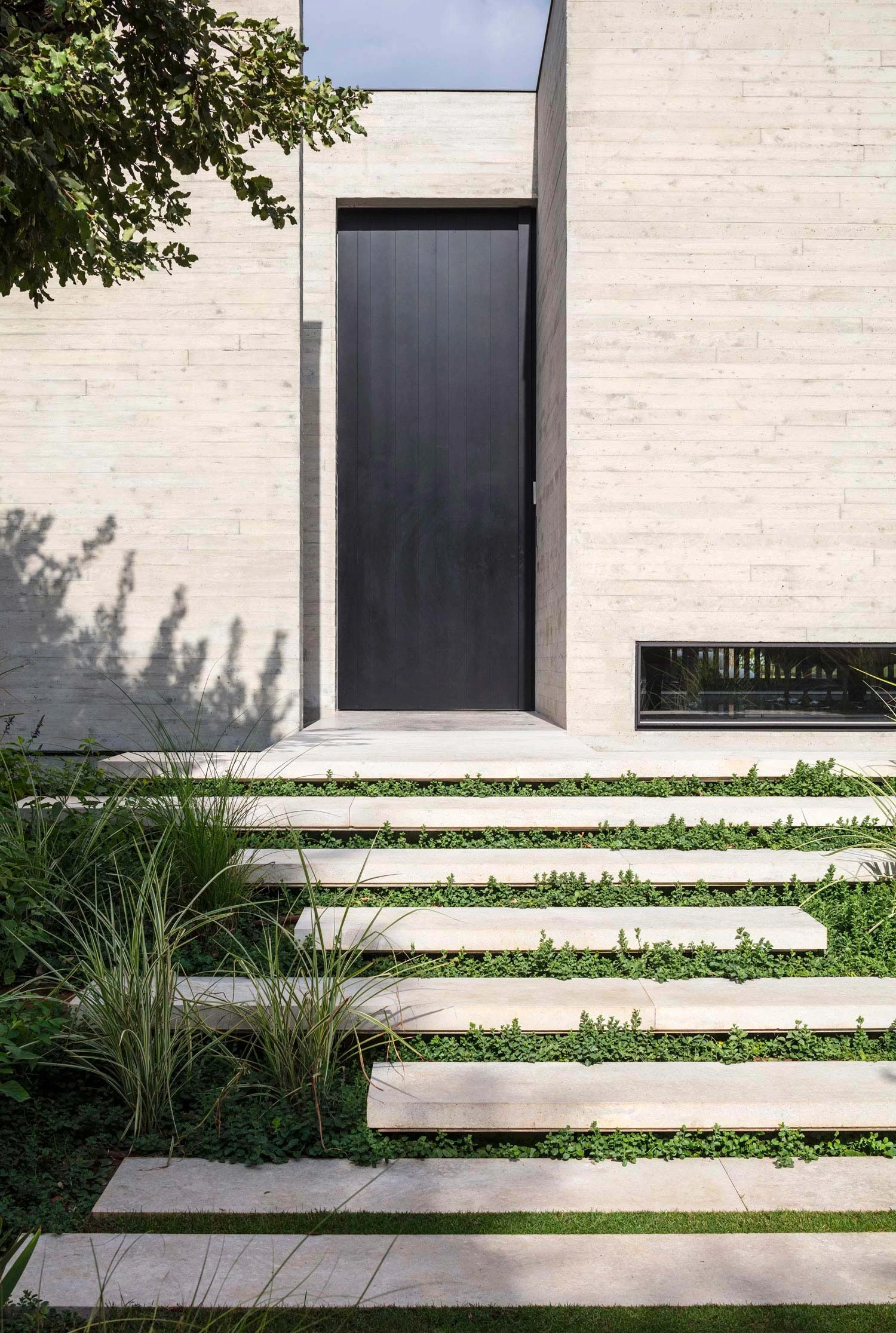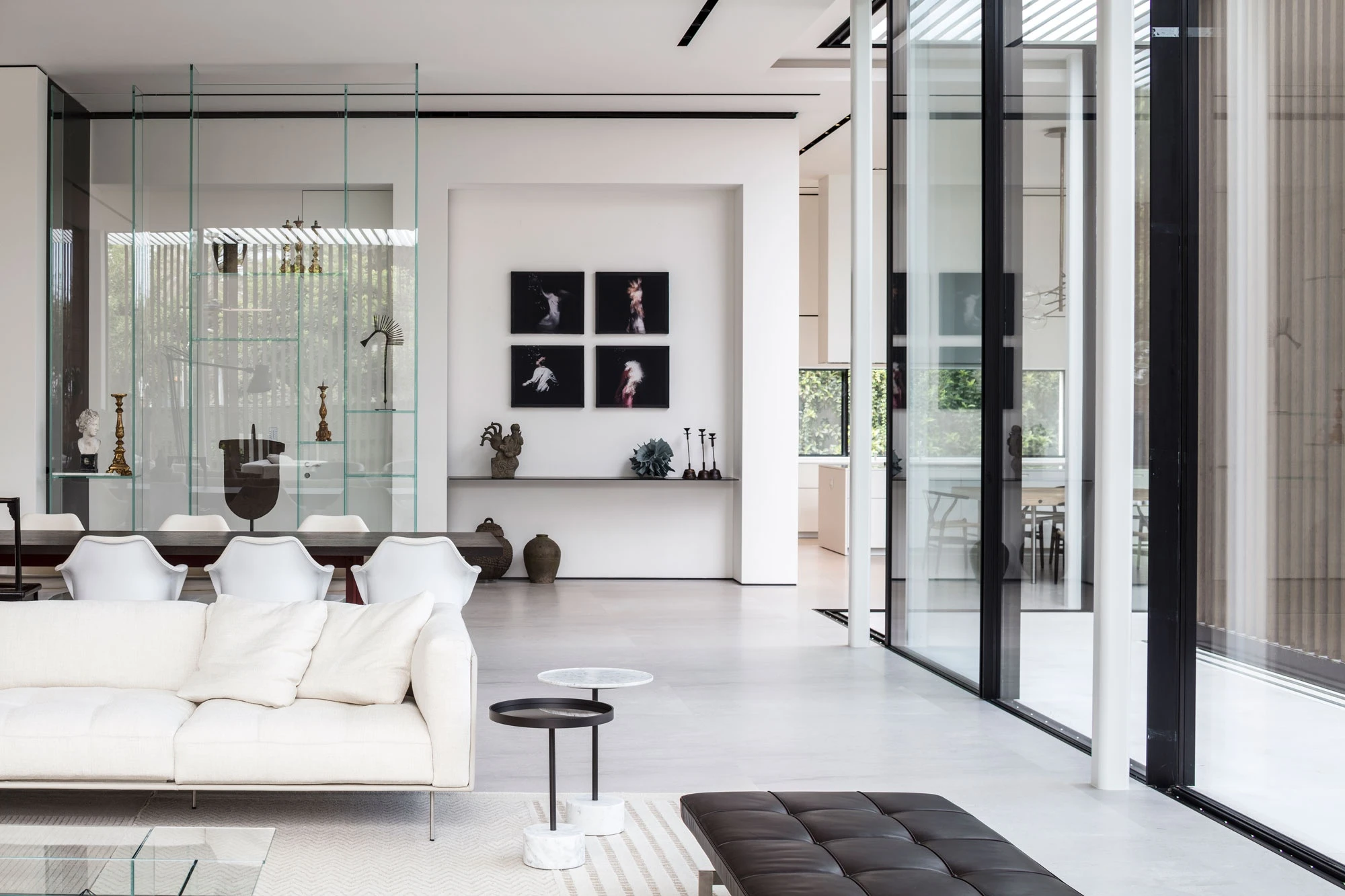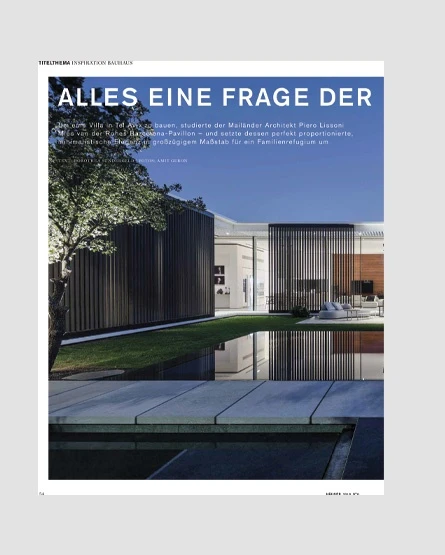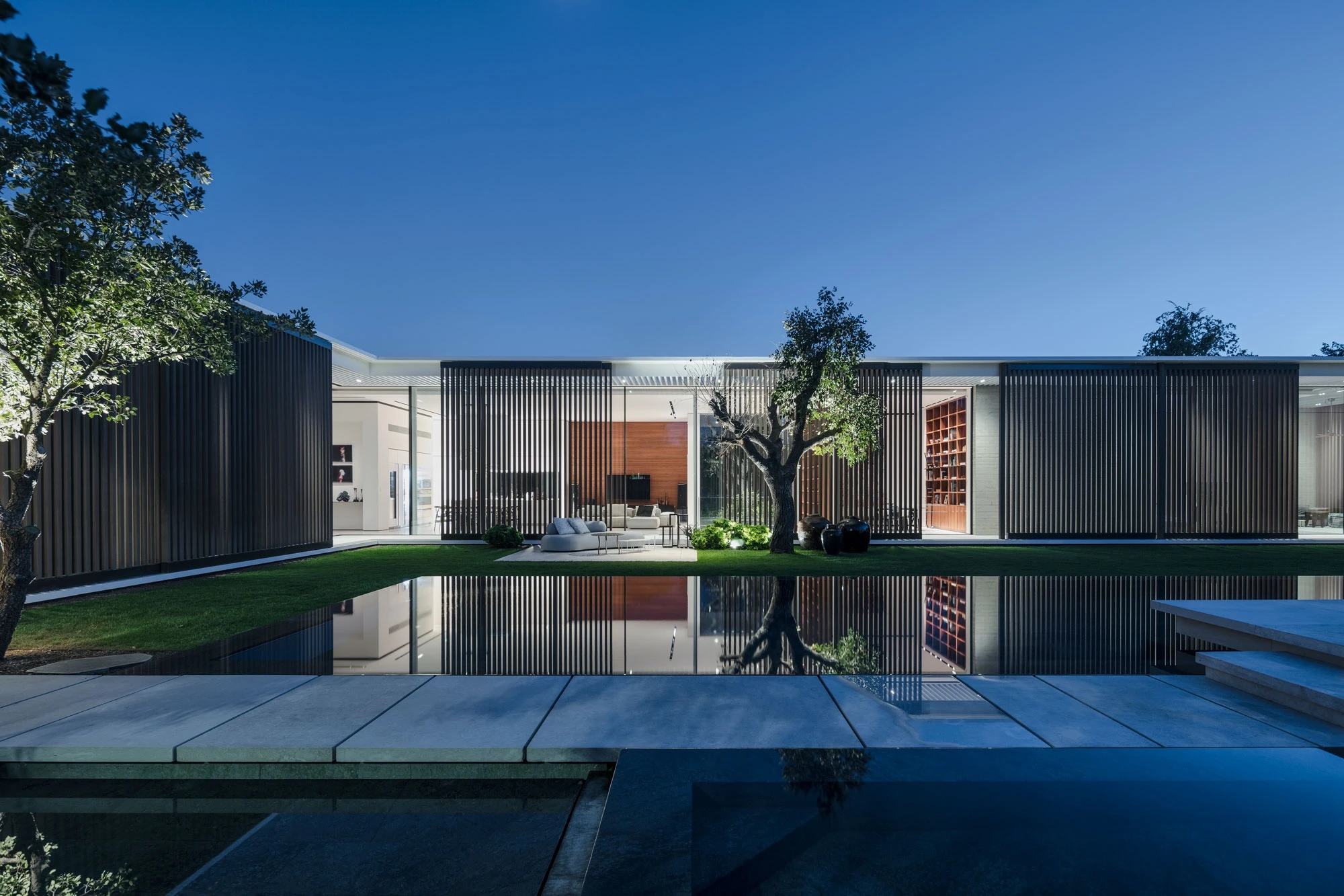 Designed with Tehila Shelef Architects, this villa in the Middle East is an austere project that possesses a pronounced orthogonality. At first sight, it appears as a pavilion floating on water. Purposely simplified, the L-shaped volumetry is inspired by modern architecture and distinguished by walls with measured openings to the outside and extensive windows towards the garden.The terrain was designed to accommodate the house, which is protected from the outside with walls of cement incorporating windows of an essential architectural design, and open towards the inside with continuous glazing that faces the softer forms of the garden. The windows are protected by wood screens which move in response to the direction of the sunlight, alternating solids and voids like a musical score and offering protection from the light, while the architectural volumetry is recomposed in a vision of total purity. The pavilion extends over two floors, with a single double-height space, where Lissoni has designed a sculptural staircase in black steel, that connects the ground floor to the lower floor.