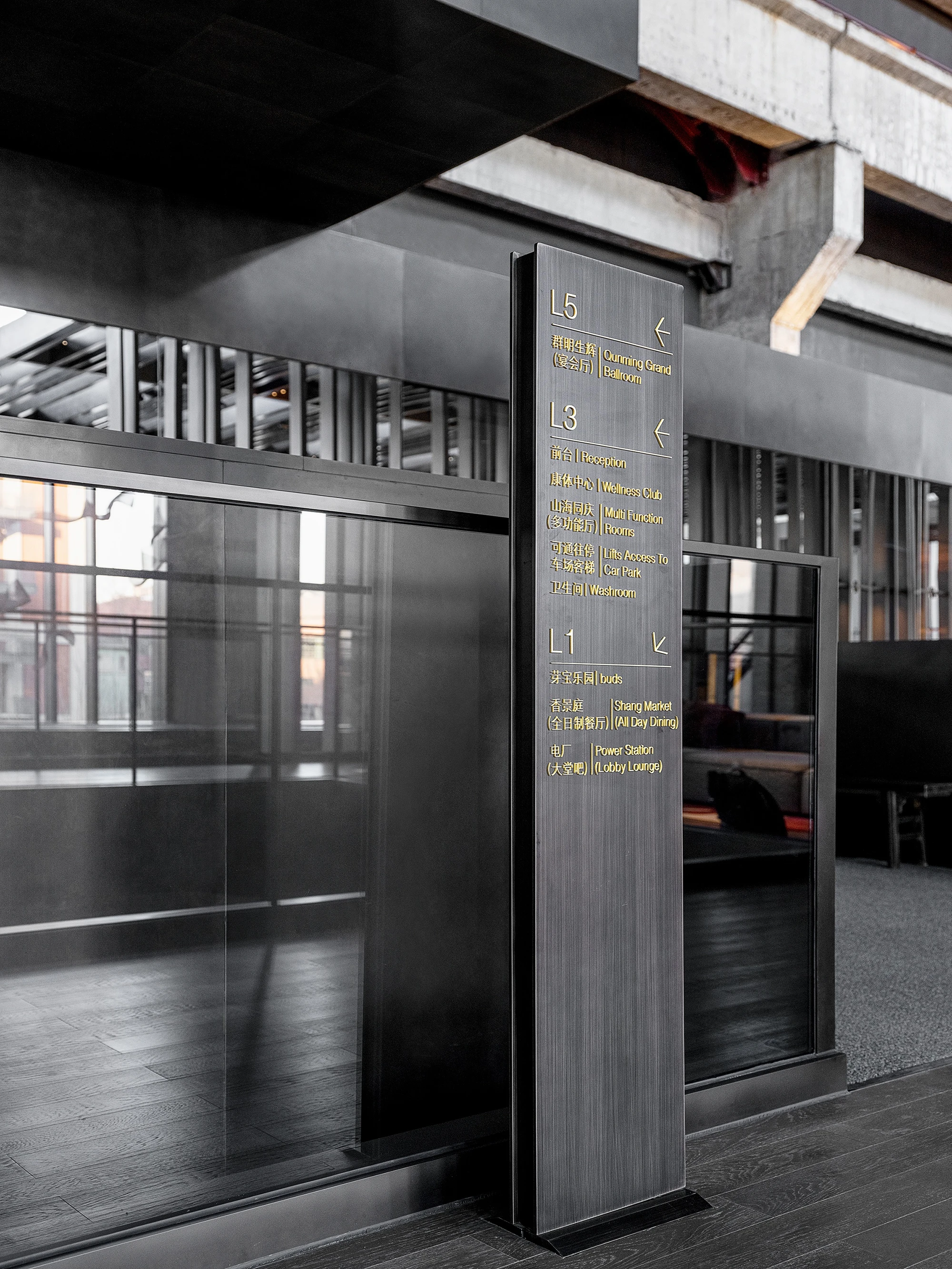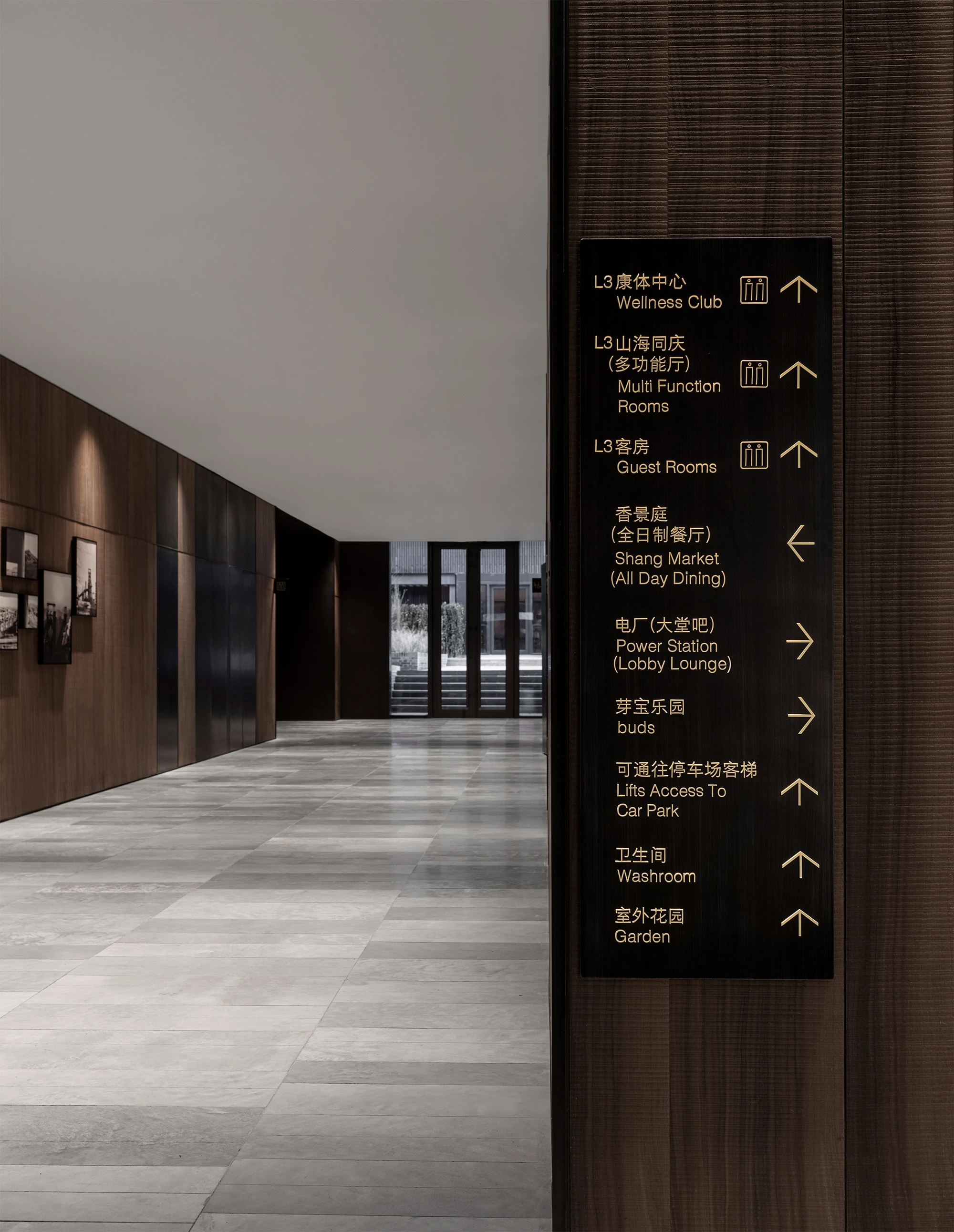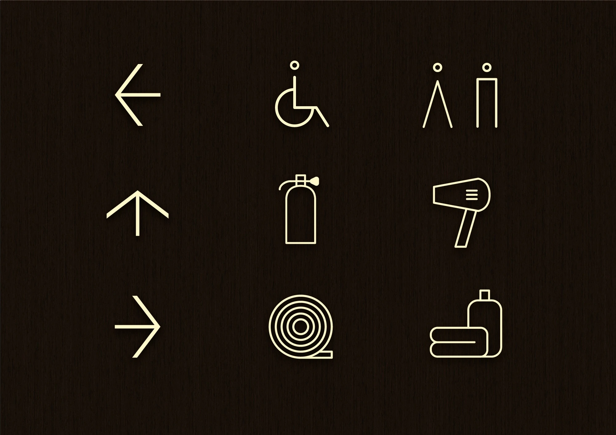 Lissoni Graphx designed the wayfinding system and signage icons for the Shangri-La Shougang Park Hotel in Beijing, China. The system encompasses everything from directional arrows to bathroom symbols to personalized buttons for every room. The design of the symbols is elegant and classic, with minimal details.