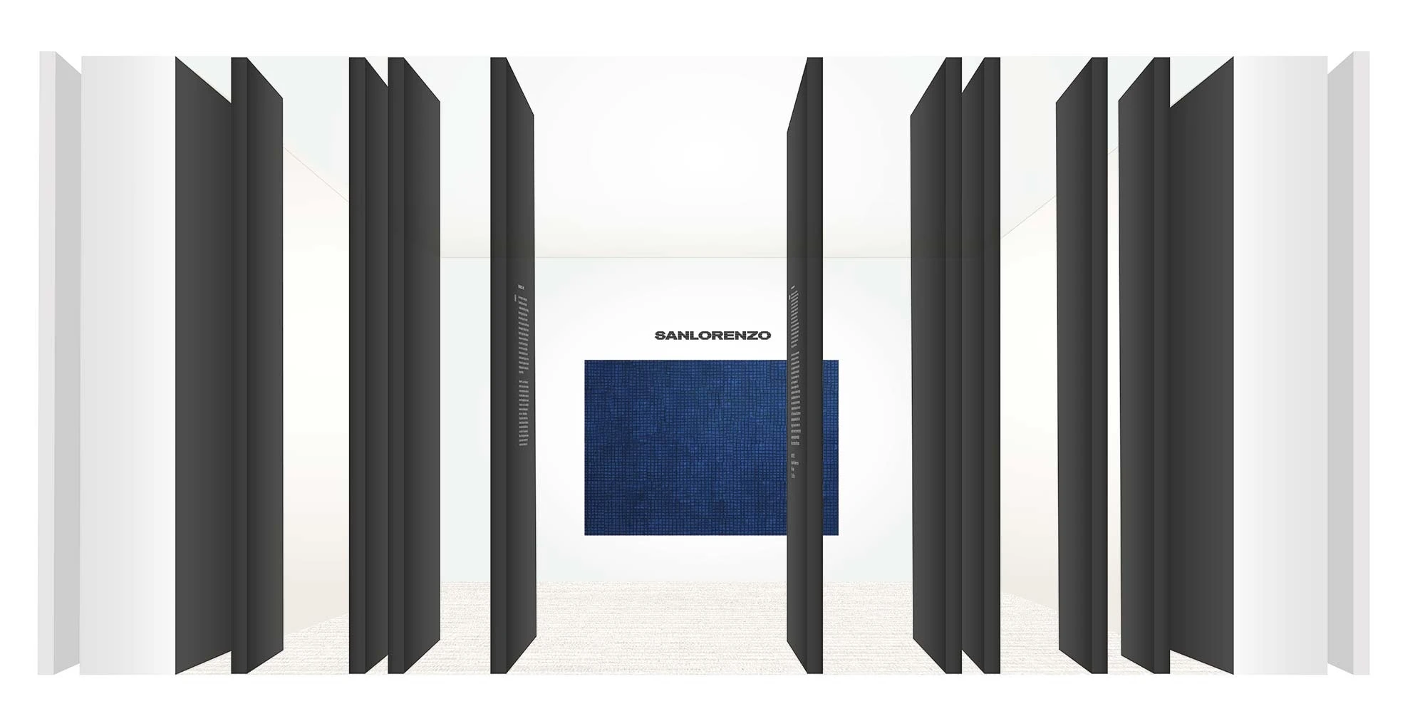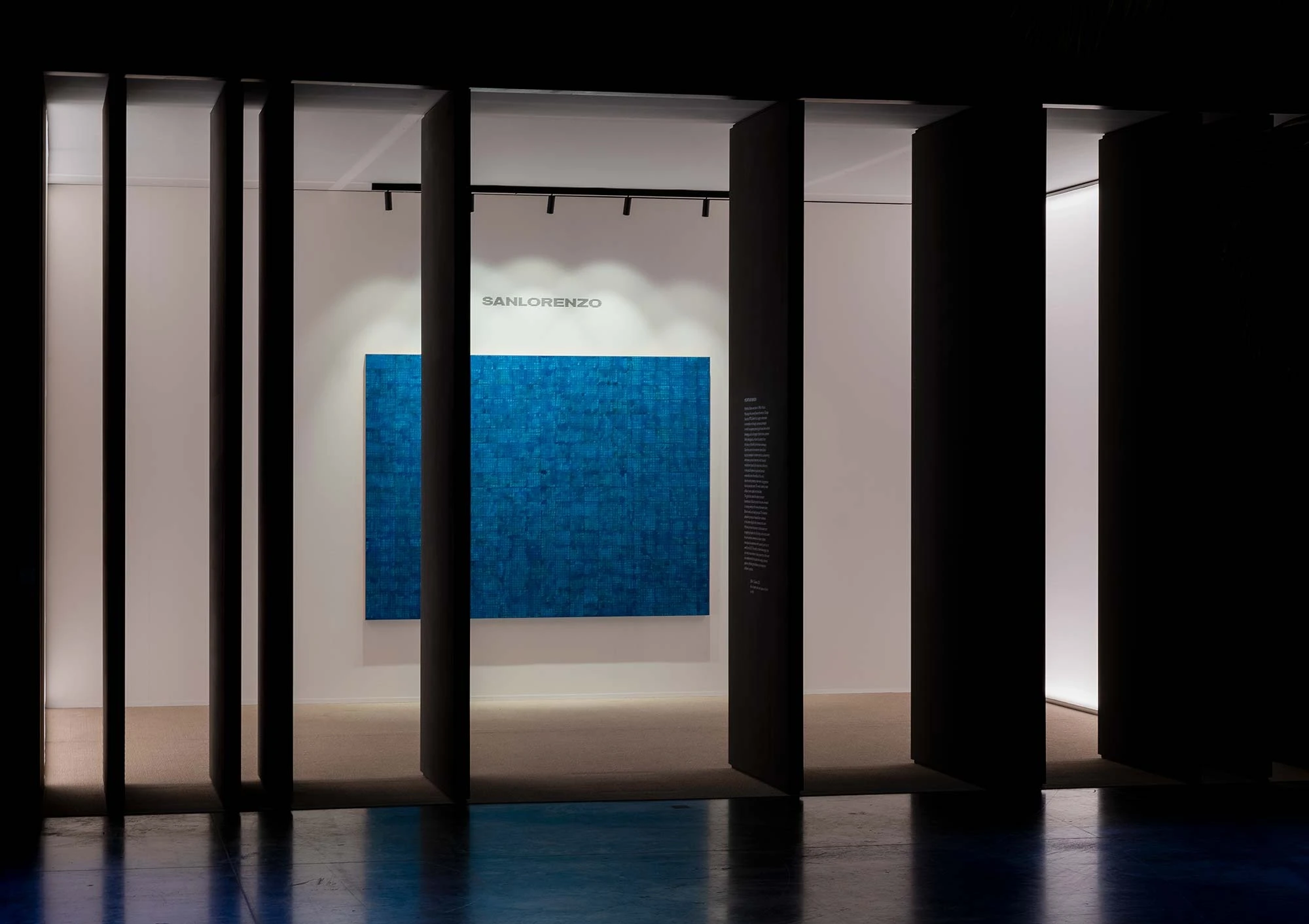 The focus of the installation is the art work of the Chicago-based painter McArthur Binion “DNA: COBALTO”. The choice of cobalt blue ink sourced from Italy represents the connection between the artist’s practice and the deeper and unchartered seafaring world of Sanlorenzo. A series of transversal vertical panels at the entrance leads towards the backlit box containing the work, and like graphic elements they modify the view, inviting the visitor to move inside in order to explore it in its entirety.