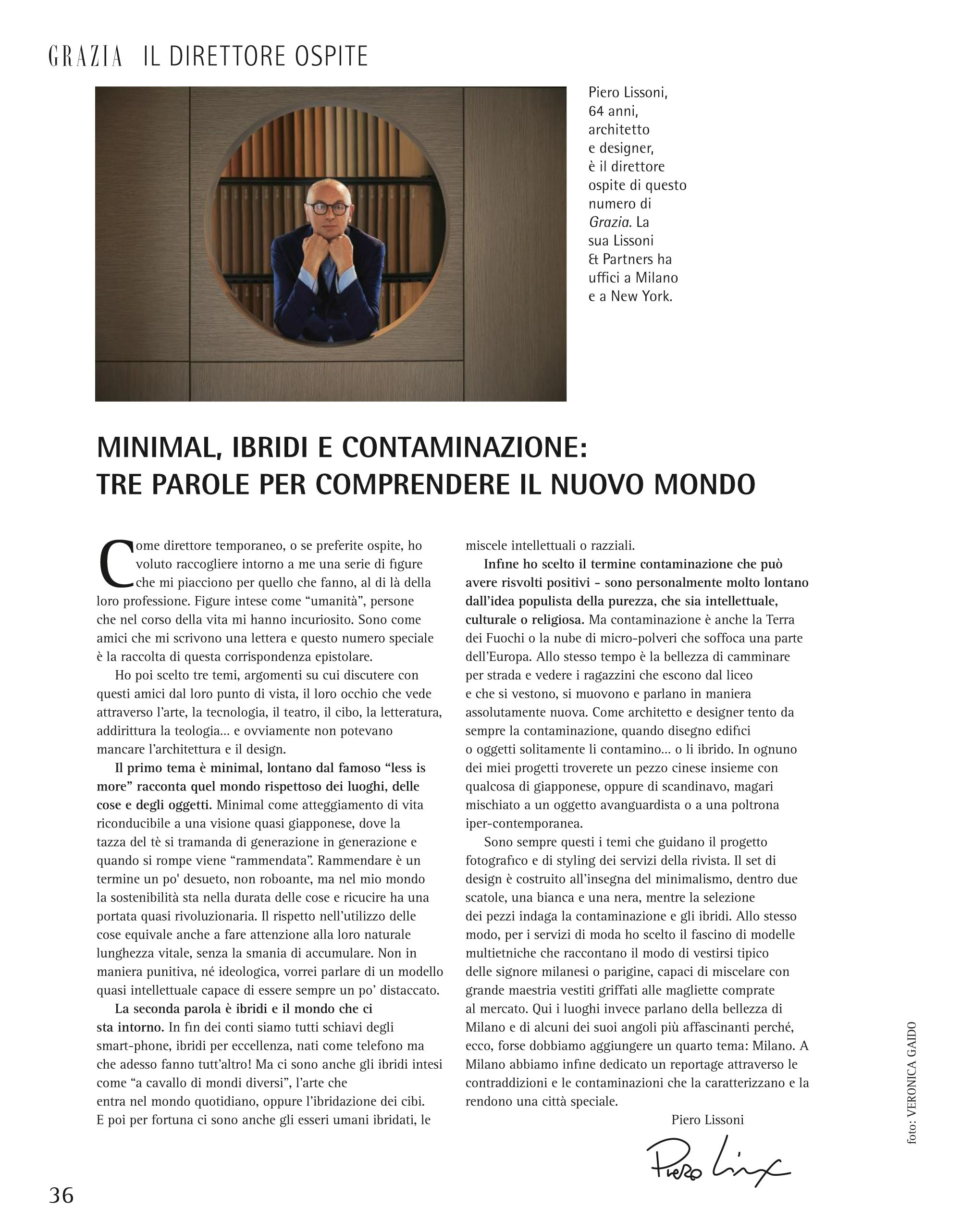 Piero Lissoni is guest editor of the magazine Grazia Italia, available on newsstands for two weeks from 15th April. A special issue with contributions by Mario Bellini, Eleonora Carisi, Francesco Dal Co, Anne Hidalgo, Stefania Lazzaroni, Antonio Manzini, Giovanna Melandri, Giorgio Metta, Davide Oldani, Maria Porro, Ferruccio Resta, Ugo Rondinone, Giuseppe Sala, Andrée Ruth Shammah, Valeria Solarino, Philippe Starck, Sergio Ubbiali and teamLab.