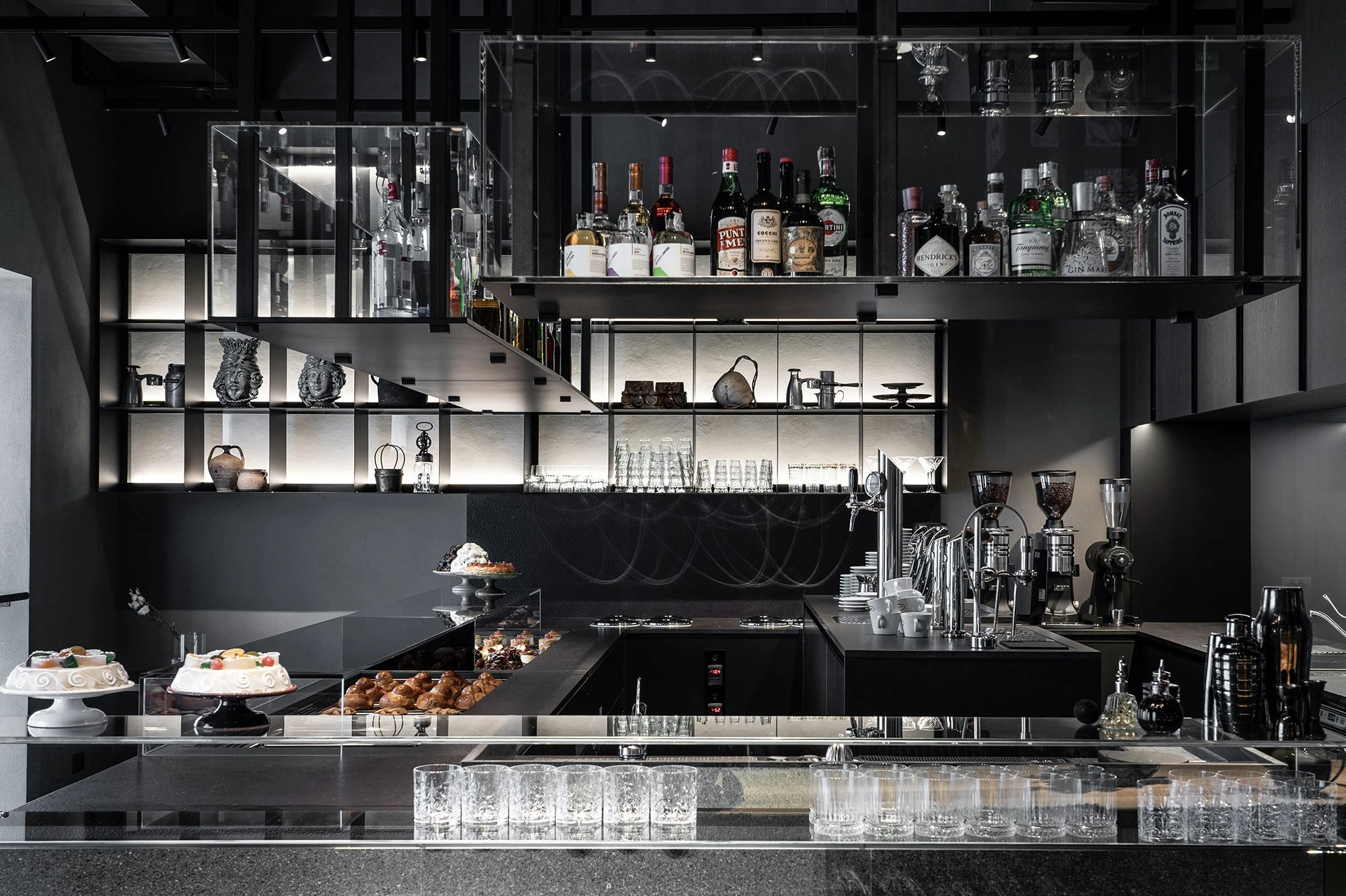 The intervention on the interiors centres on the ground floor of a small building and the elegantly interpreted interior accentuates the contrast with the baroque façade. The structural features resulting from preceding interventions formed the starting point for a project that maintained and enhanced these elements rather than conceal them, making the architectural container a neutral component on which to weave a contemporary interpretation of the locations’s history.