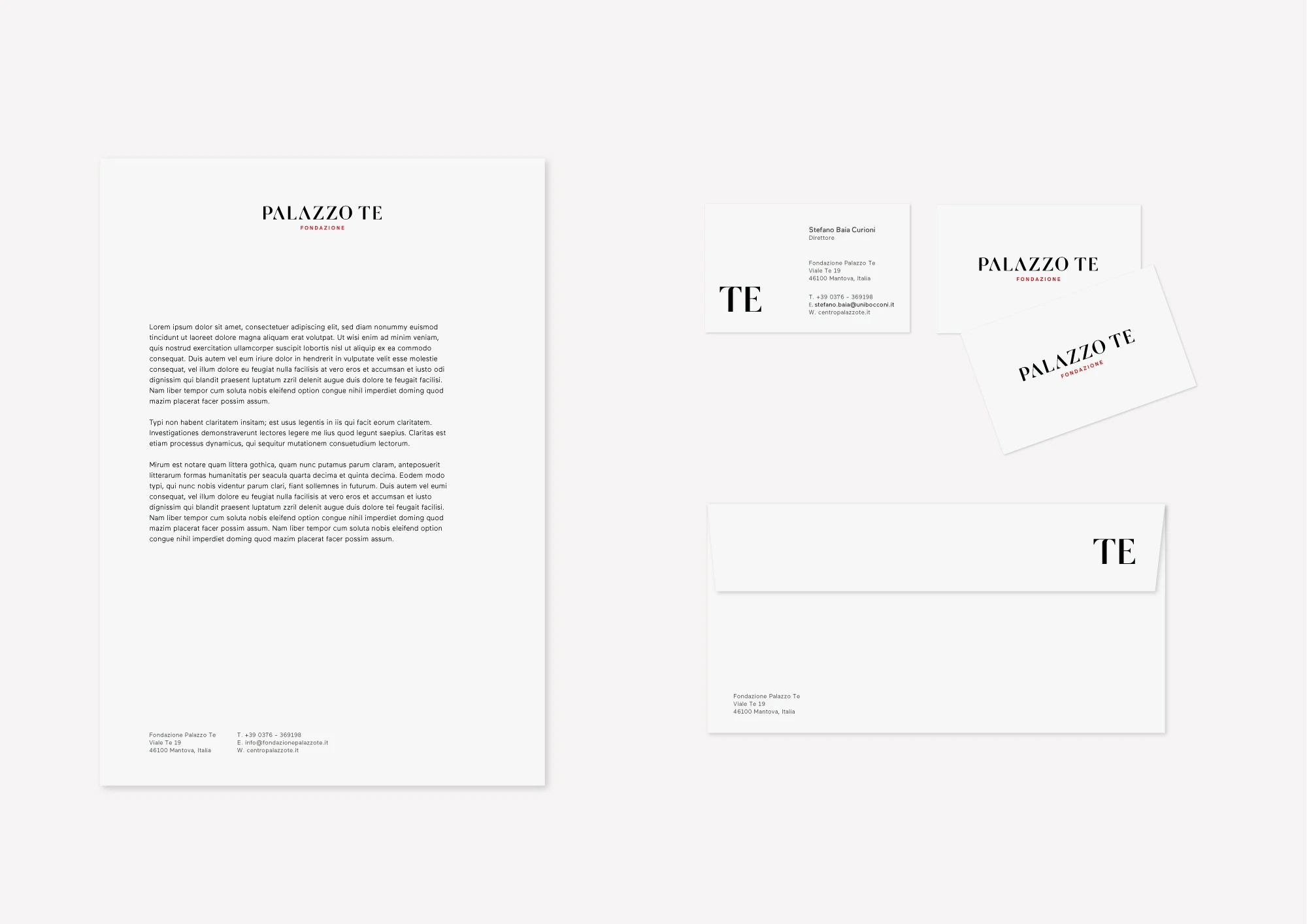 In the typography, the letter T is inspired by architectural elements and the forms that light and shadows define on the archways of the building. The font is a combination of serif and san serif, while in the various applications - such as the Foundation, the Museum and Spazio Te – it was important to use colors closely linked to the history of Mantua, earthy shades that summon up the frescoes and paintings inside Palazzo Te.