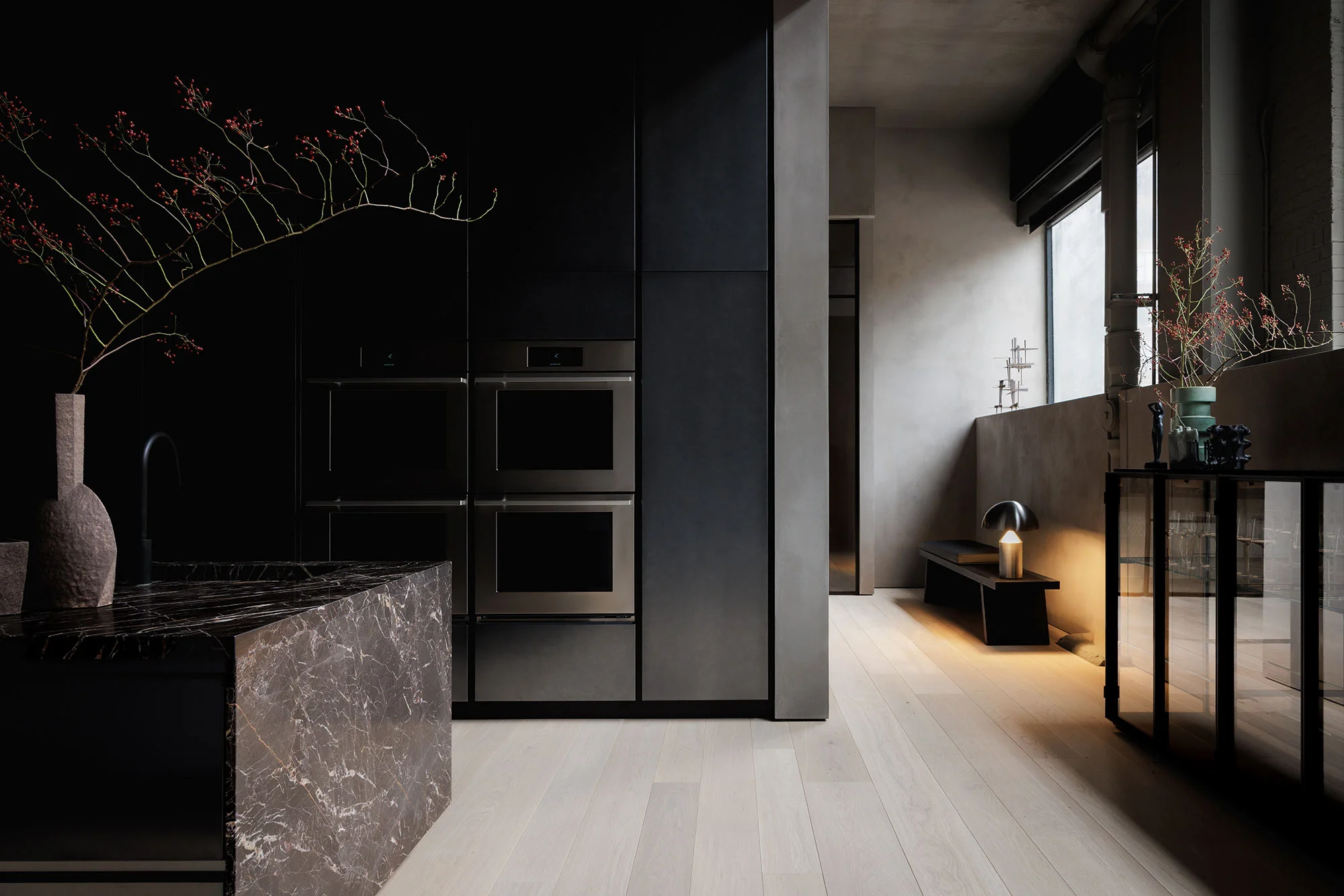 The products take center stage against a backdrop of neutral materials. Refined white oak flooring unifies the entire space, while the walls and columns are hand-troweled with an earthy shade of roman plaster, revealing the imperfections of the pre-existing architecture. Almost all the ceilings were left exposed in order to reinforce the relationship between the modern interiors and the rich history of the site.